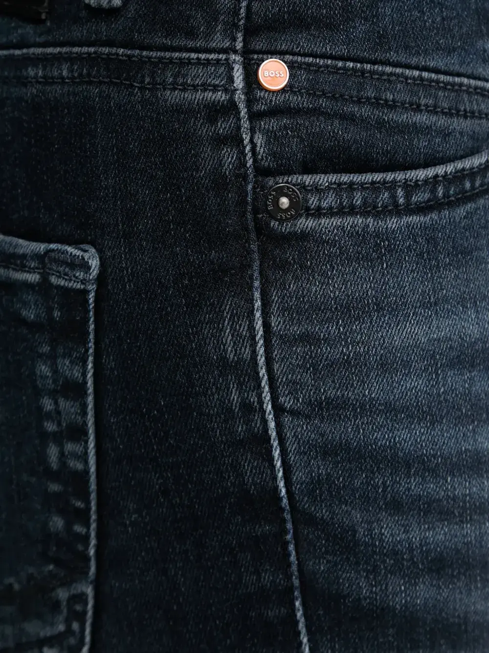 темно-синий ремень, нашивка с логотипом на поясе сзади, боковые разрезы, пять карманов, тональная строчка