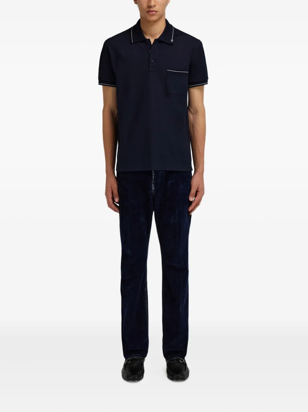 темно-синяя хлопковая пике, нагрудный карман, ребристые края, боковые разрезы, деталь gancio на воротнике