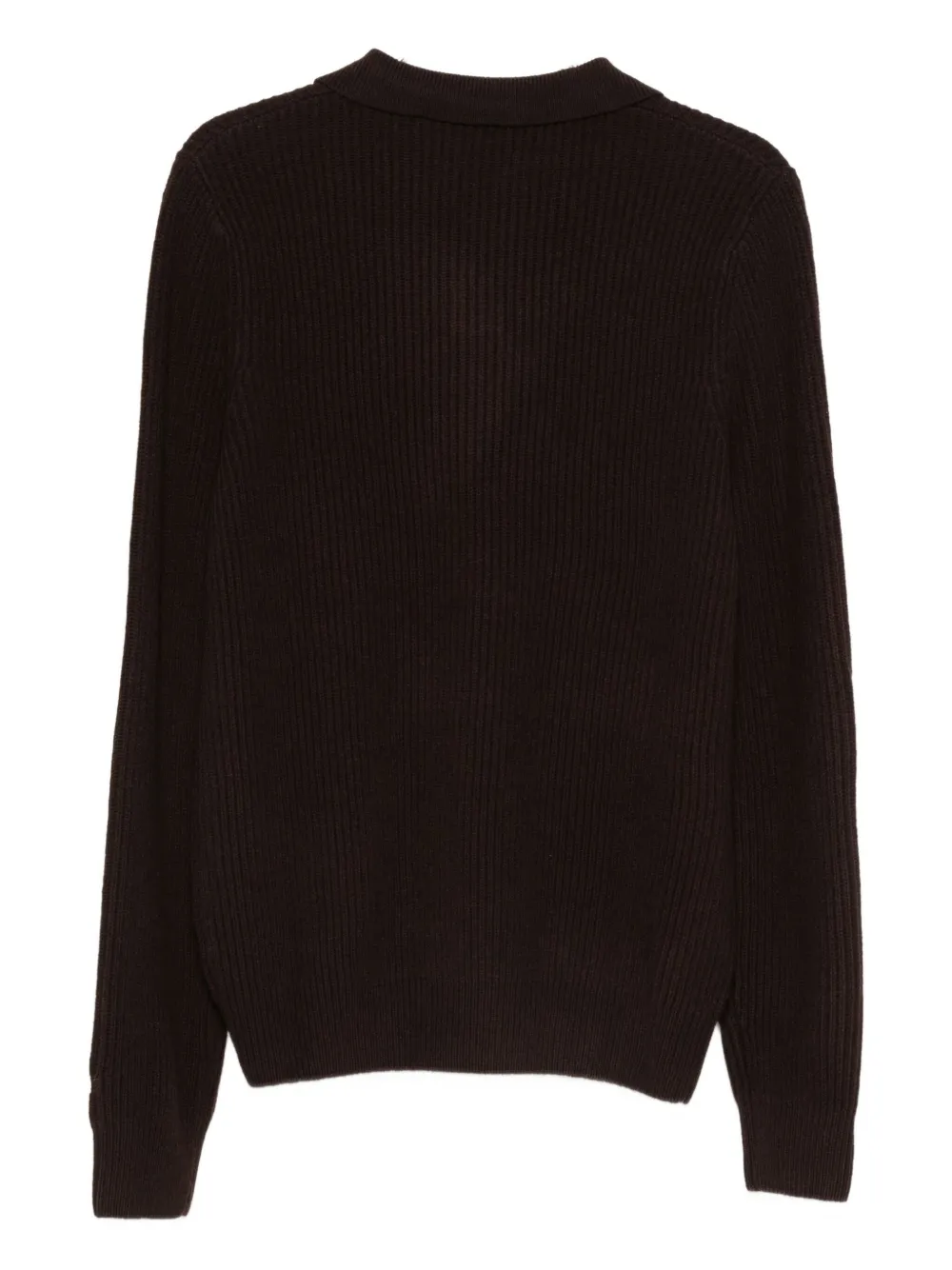 темно-коричневый вязаный в рубчик топ с воротником, V-образным вырезом, длинными рукавами и вышитым логотипом