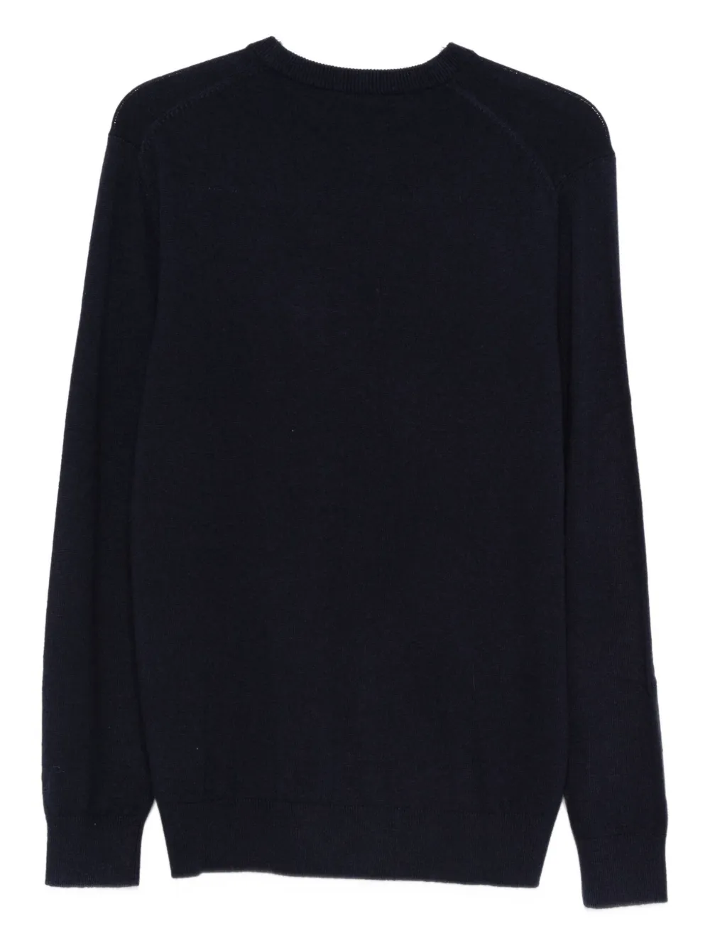 темно-синий шерстяной свитер с яблочным мотивом, вышивкой надписи, круглым вырезом и длинными рукавами
