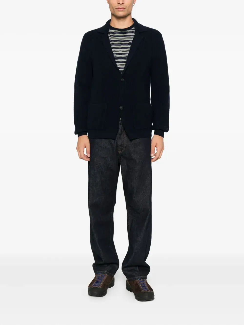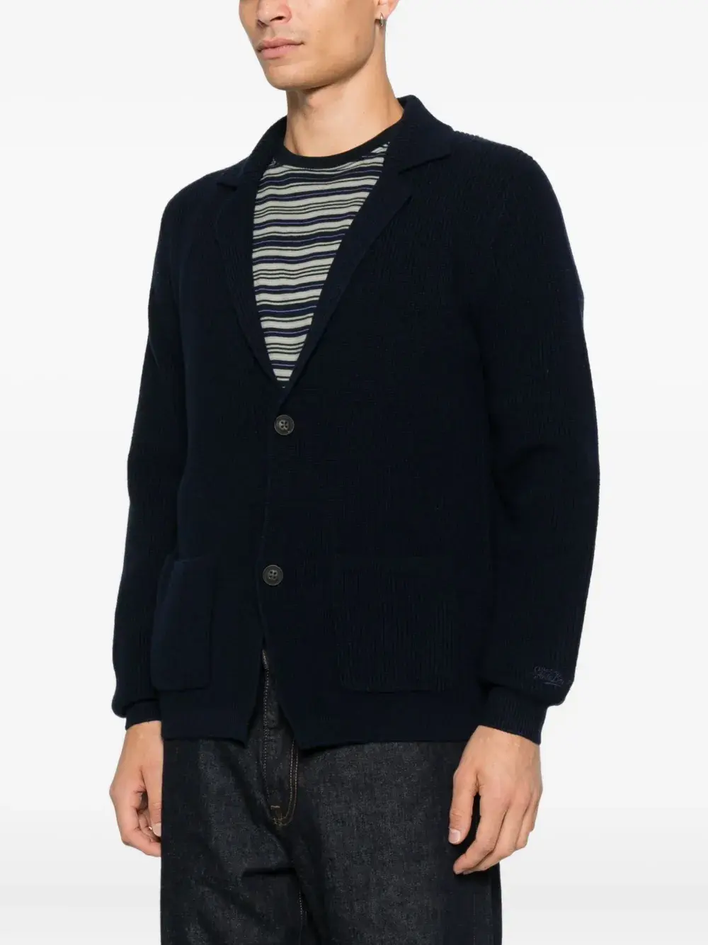 тёмно-синий шерстяной пиджак с лацканами с вырезом, застёжкой на пуговицы спереди, двумя накладными карманами спереди и длинными рукавами