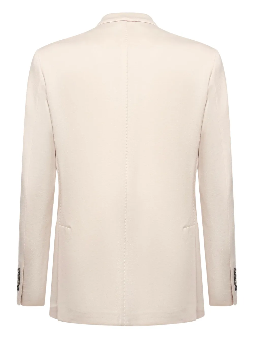 бежевый двубортный пиджак на пуговицах с клапанами на карманах, прорезным карманом и длинными рукавами