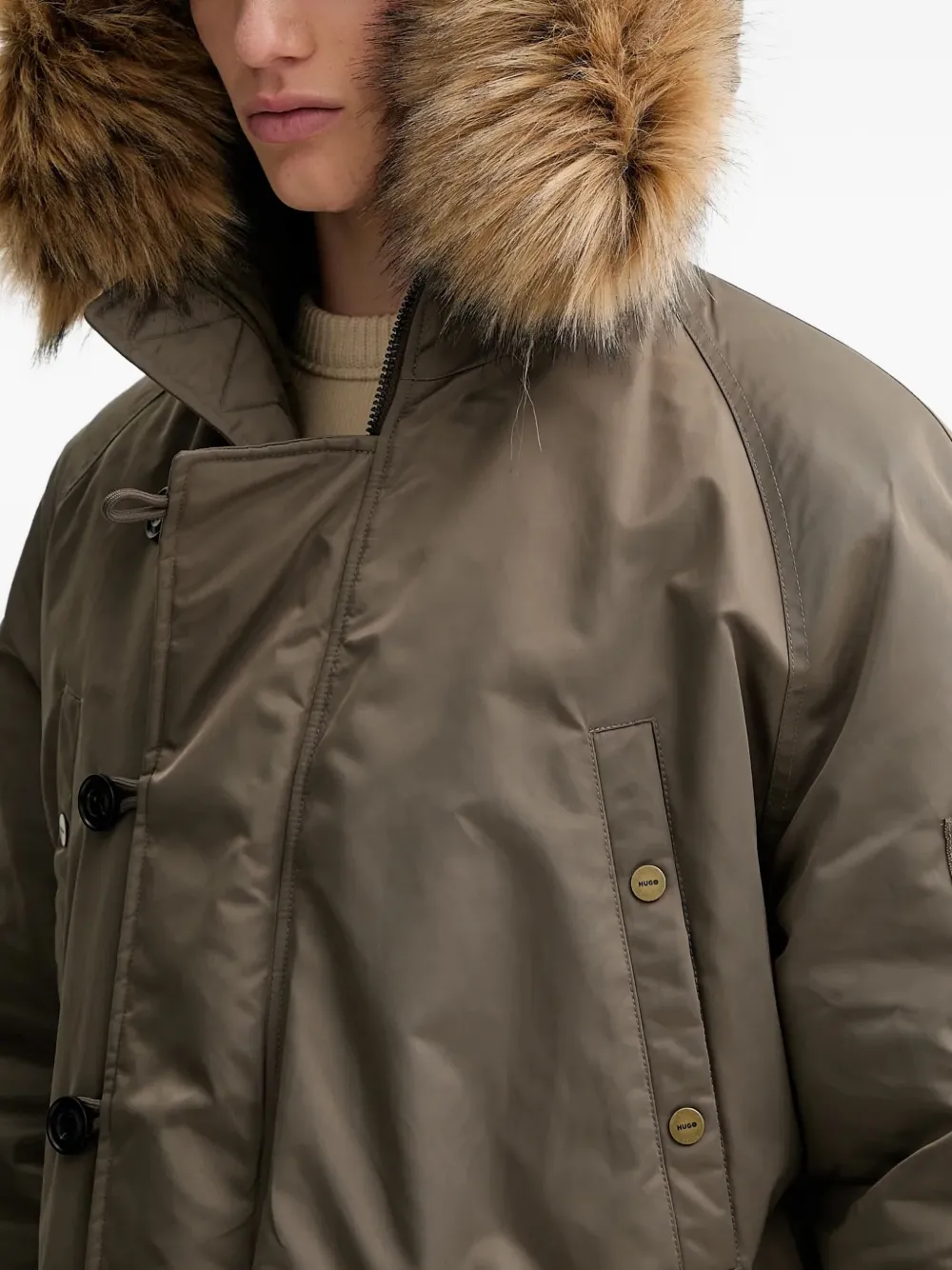 серый искусственный мех застегивается на пуговицы молния на рукаве накладные карманы застежка на молнии застежка на кнопках