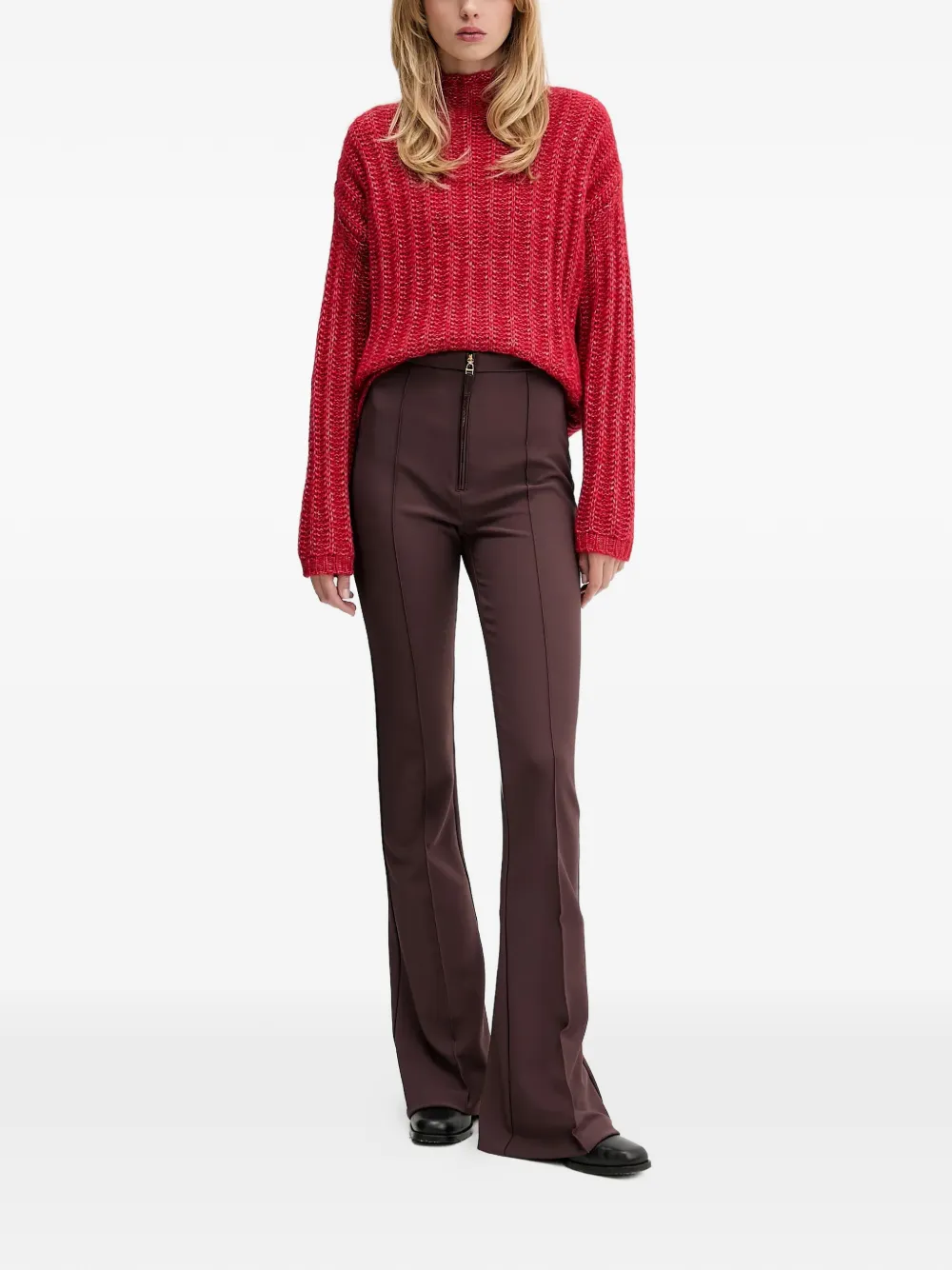 красный фактурный вязаный свитер с высоким воротником и длинными рукавами