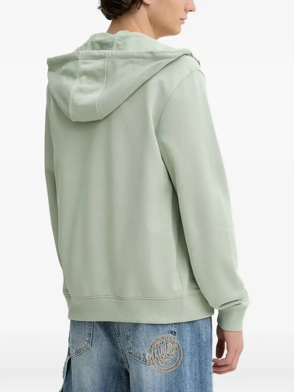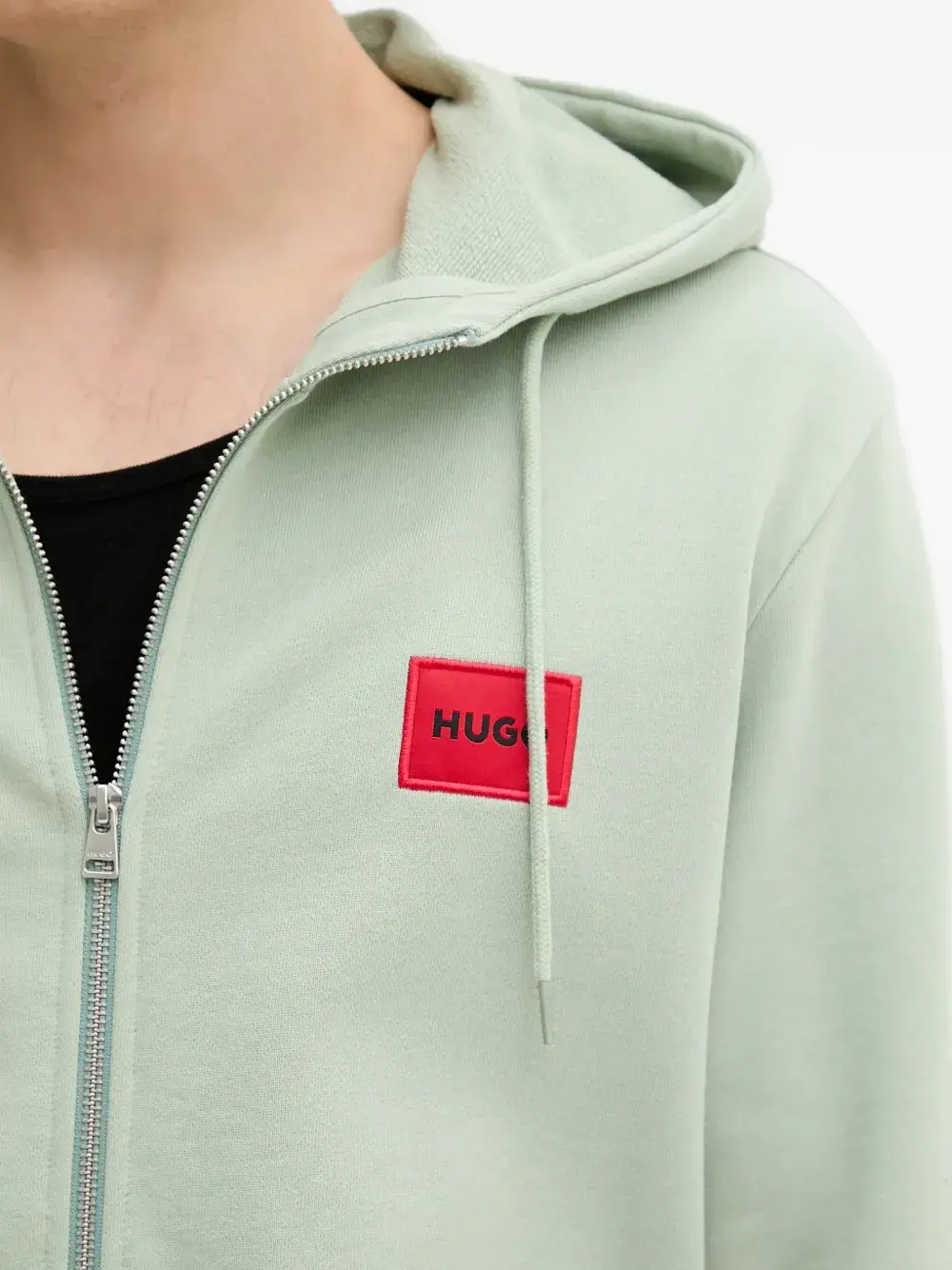 светло-зелёный худи с нашивкой-логотипом, застёжкой-молнией, капюшоном, длинными рукавами и ребристым подолом