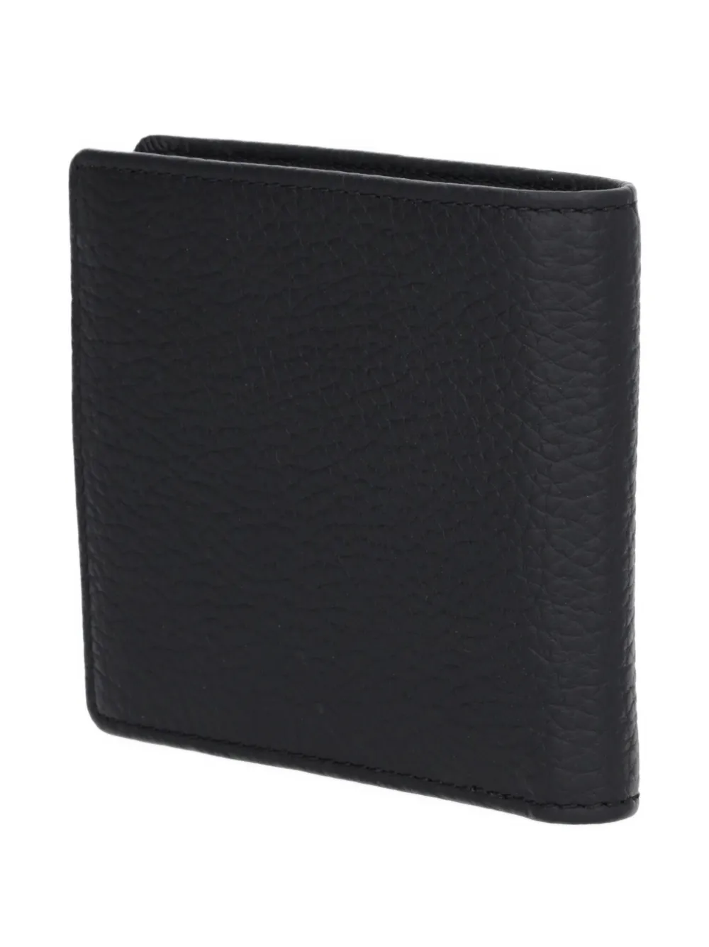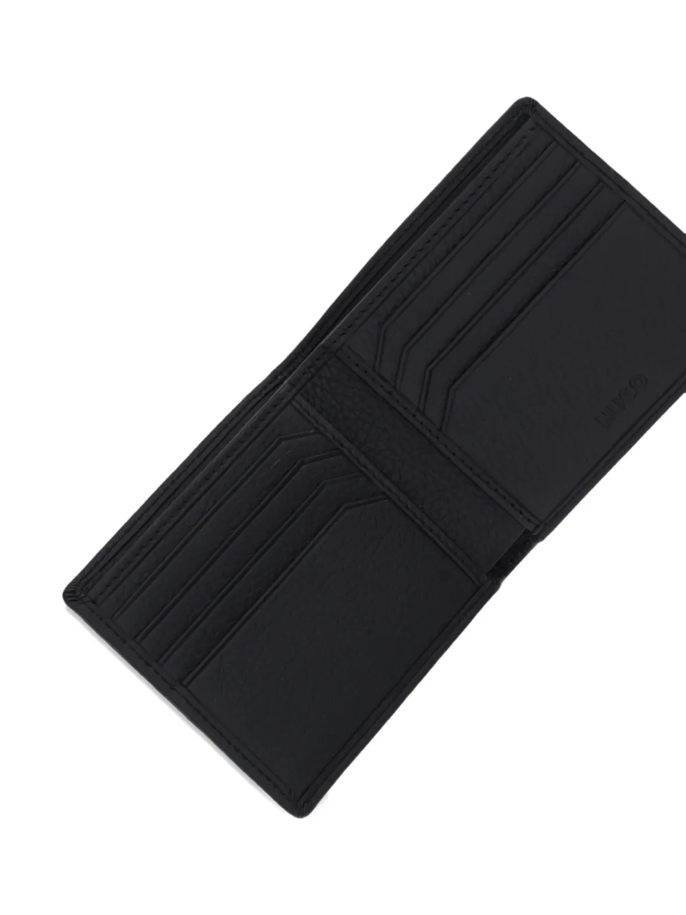 чёрный кошелёк-бифолд с тиснённым логотипом, слотами для карт, отделением для купюр и зернистой текстурой