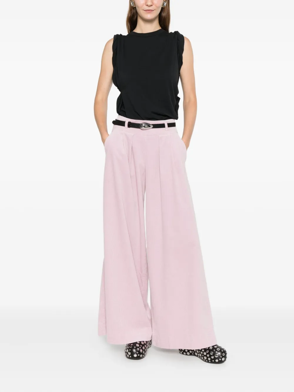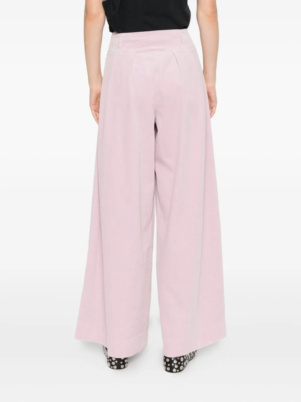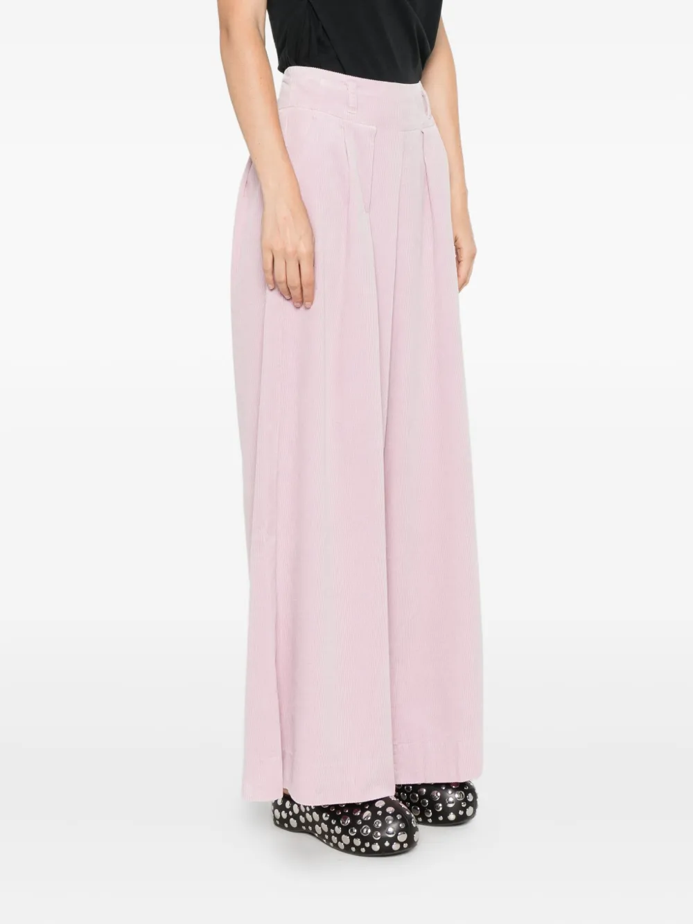 светло-розовый вельвет, фактурная ткань, защипы спереди, широкий крой брюк, боковые карманы, шлевки для ремня