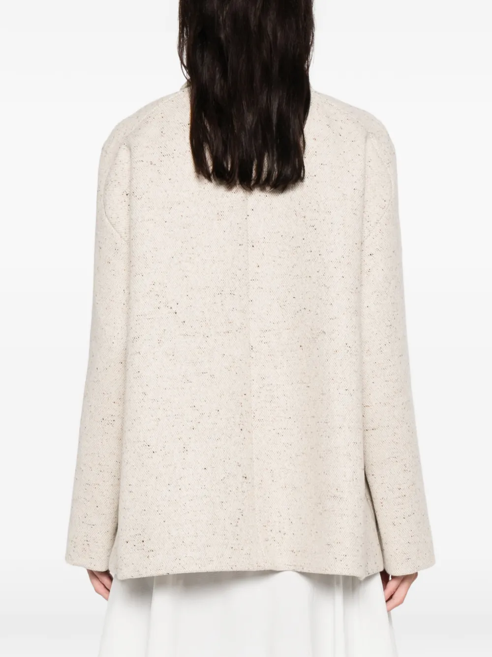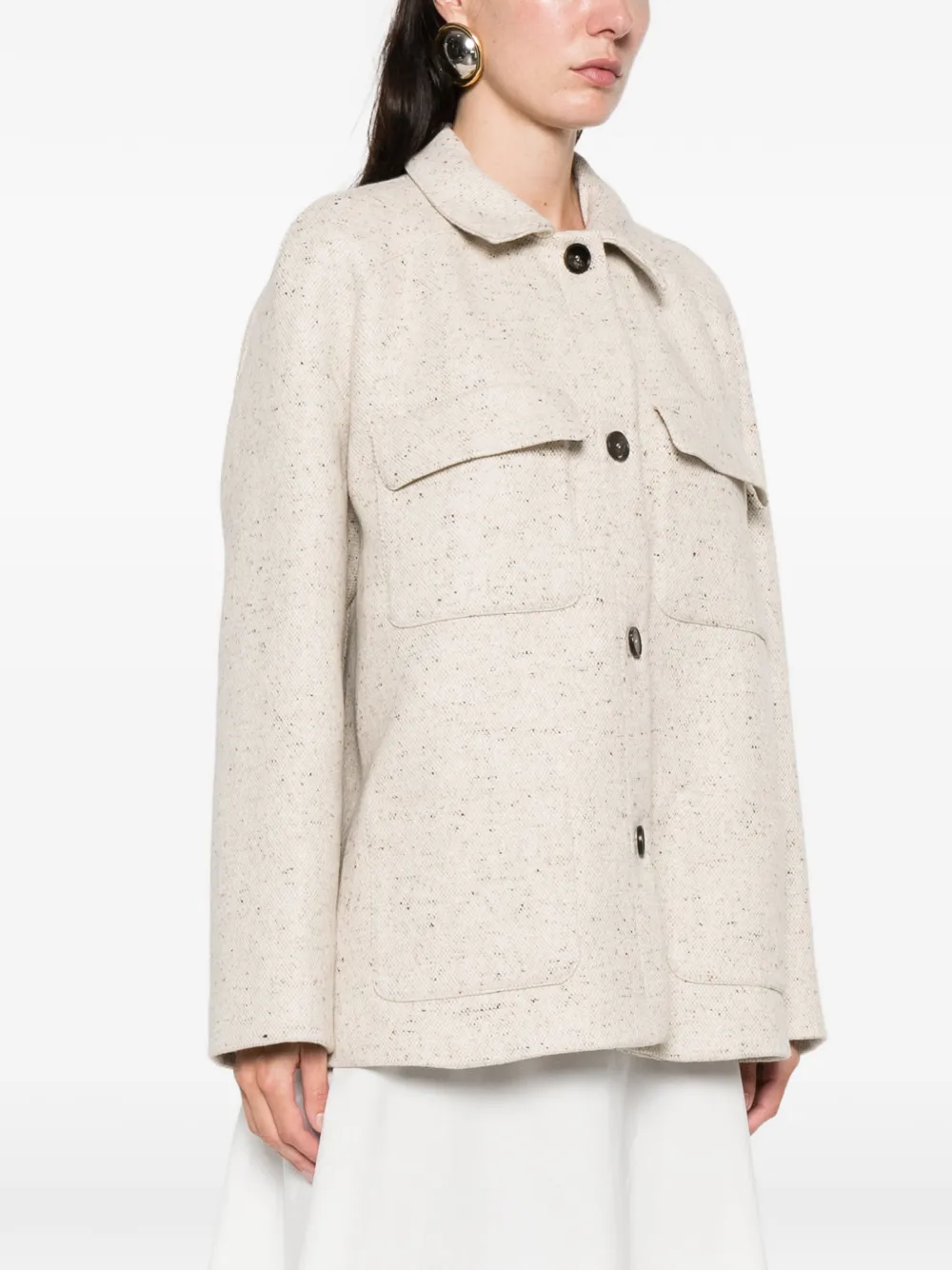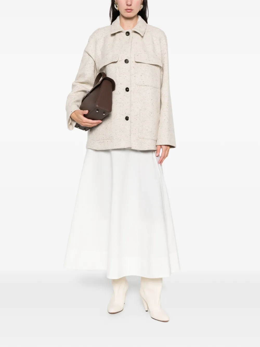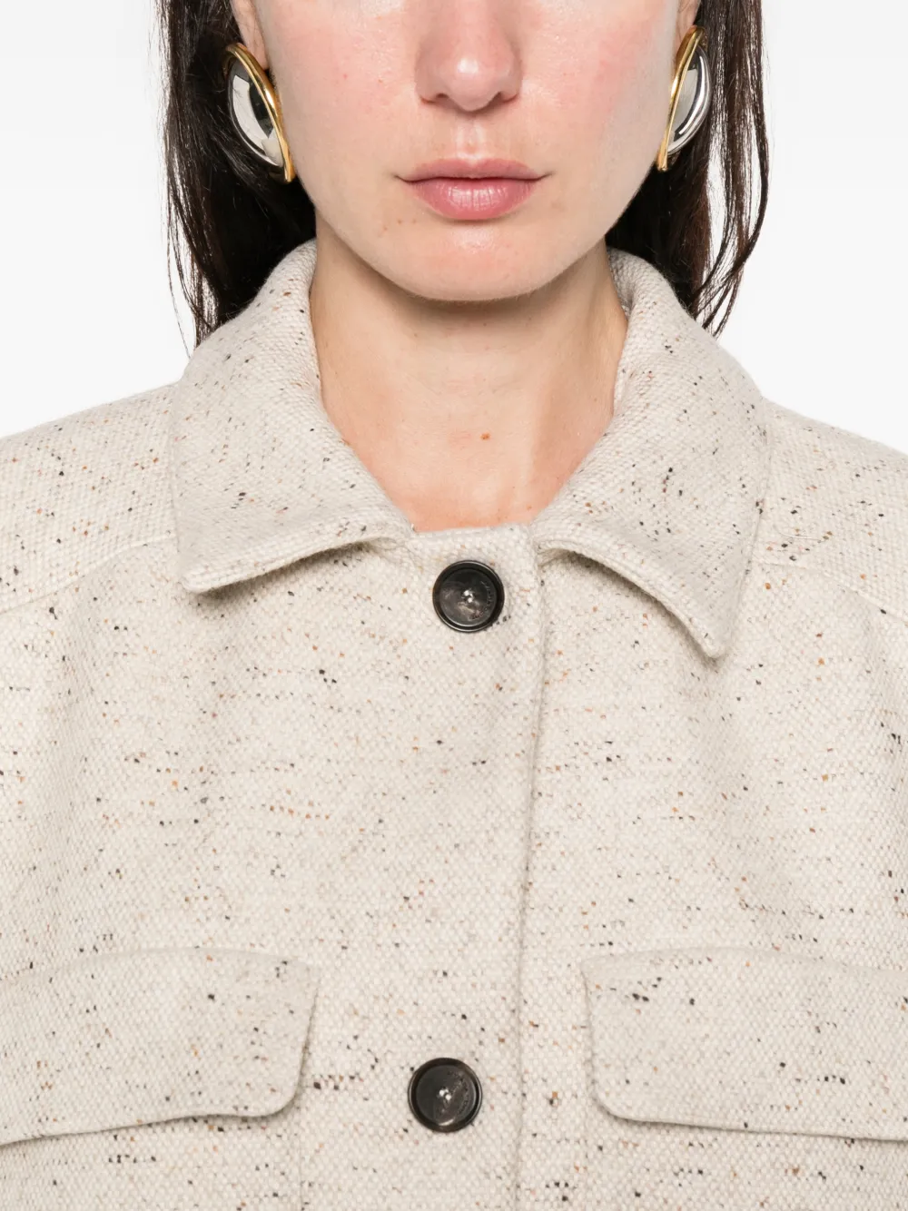 косточково-бежевый цвет, застежка на пуговицы спереди, два нагрудных кармана с клапанами, длинные рукава, прямой низ