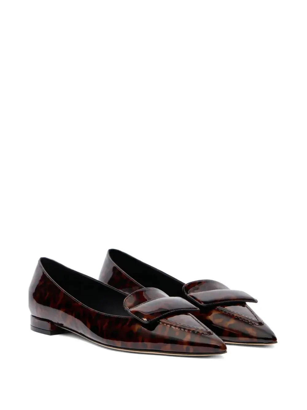 темно-коричневые лоферы с перемычкой, заостренный носок, объемный upper, плоская подошва, леопардовый рисунок, глянцевая отделка