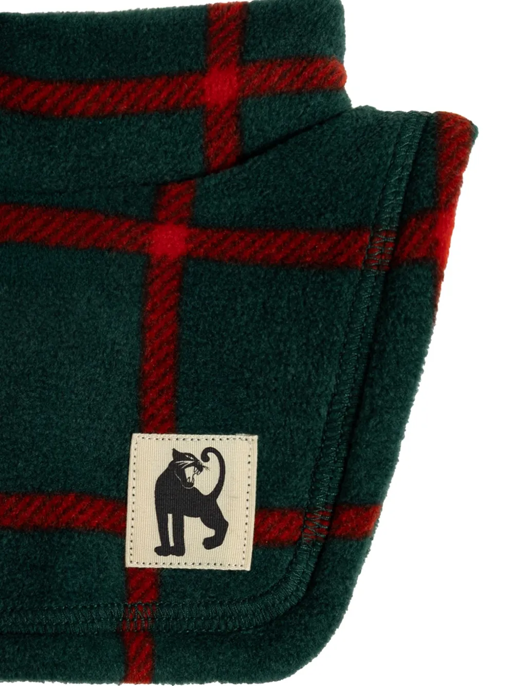 зелёный свитер с клетчатым узором, нашивкой с логотипом, высоким воротником и застёжкой на пуговицы