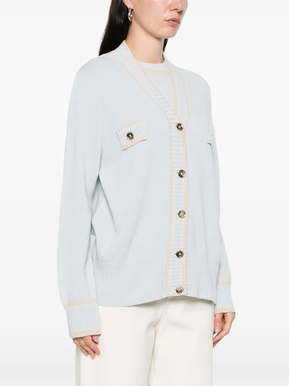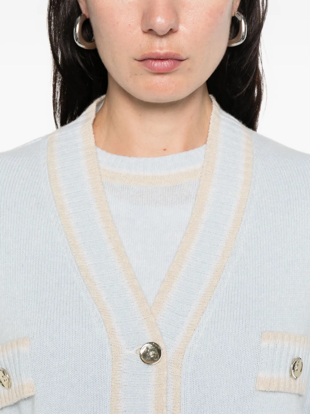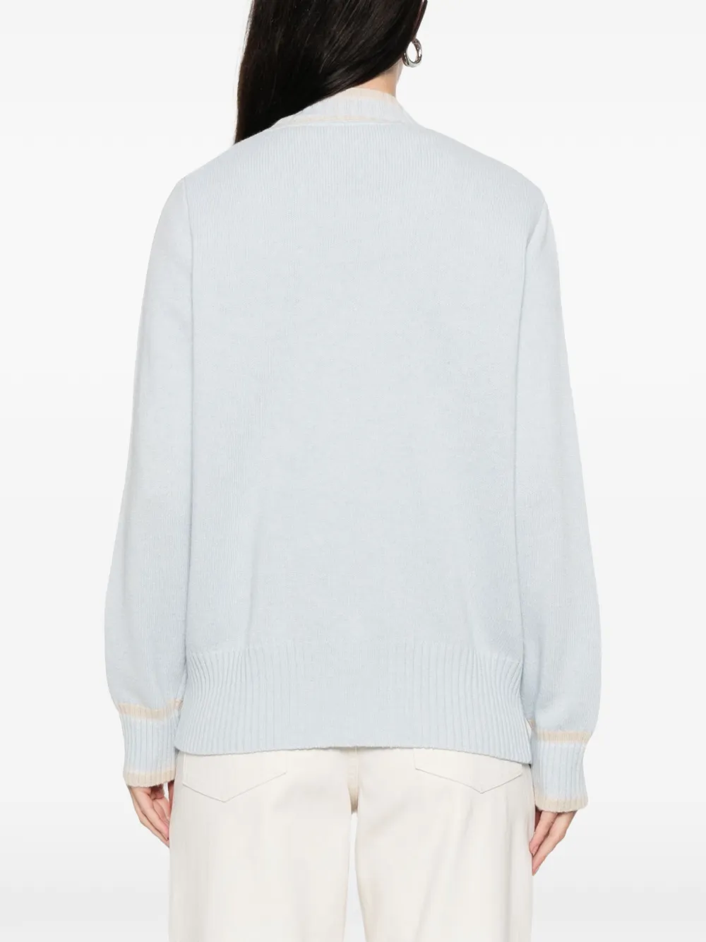 светло-голубой вязаный материал, V-образный вырез, длинные рукава, ребристый низ