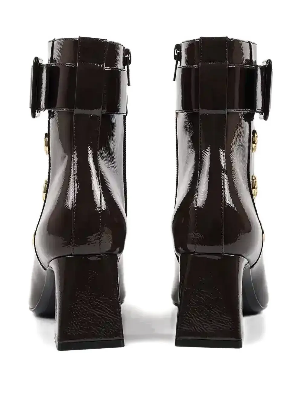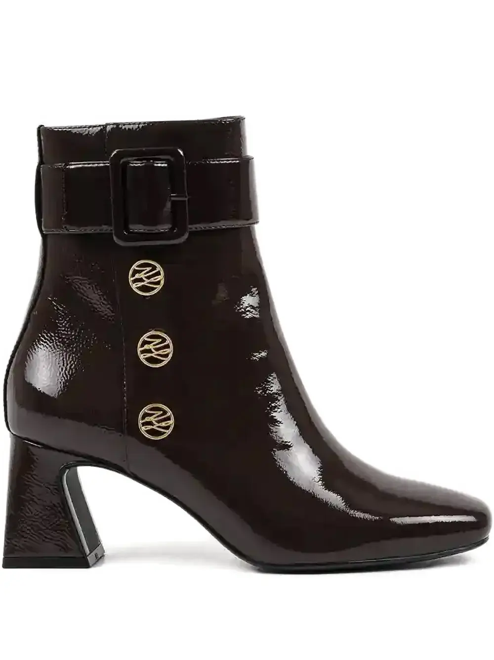 темно-коричневый цвет, пряжка, пуговицы золотистого оттенка, каблук-«кирпичик», застежка-молния, квадратный нос