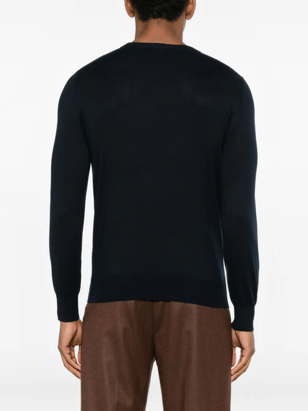 синий джемпер с круглым вырезом, длинными рукавами, мелкой вязкой, прямым низом и ребристыми манжетами