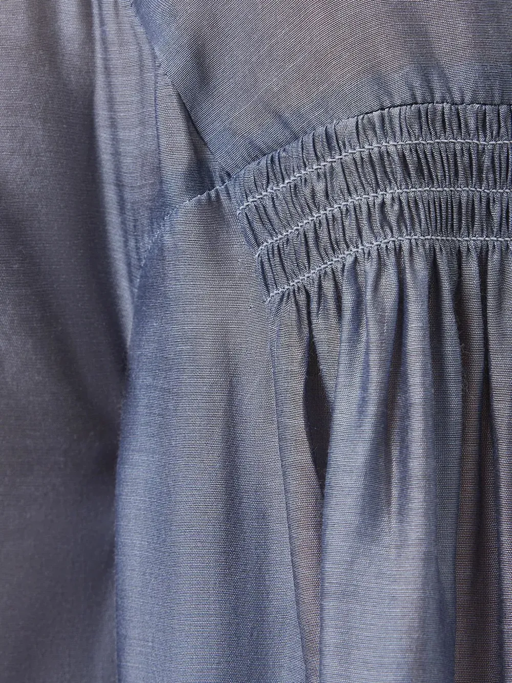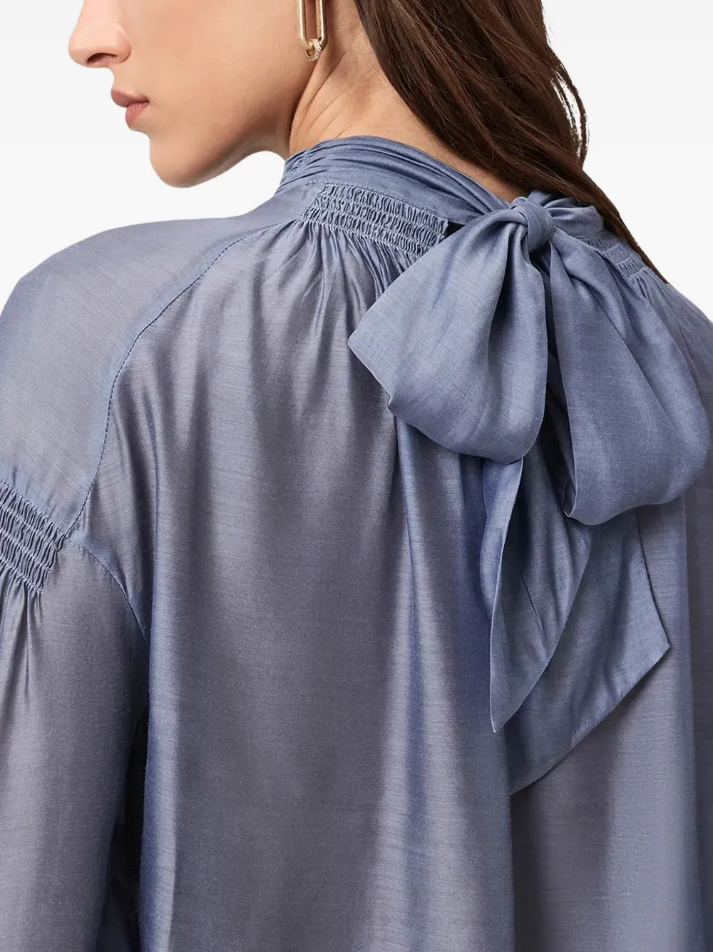 сиренево-серый цвет, детали со сборкой, бантик, высокий воротник, длинные рукава, манжеты на пуговицах