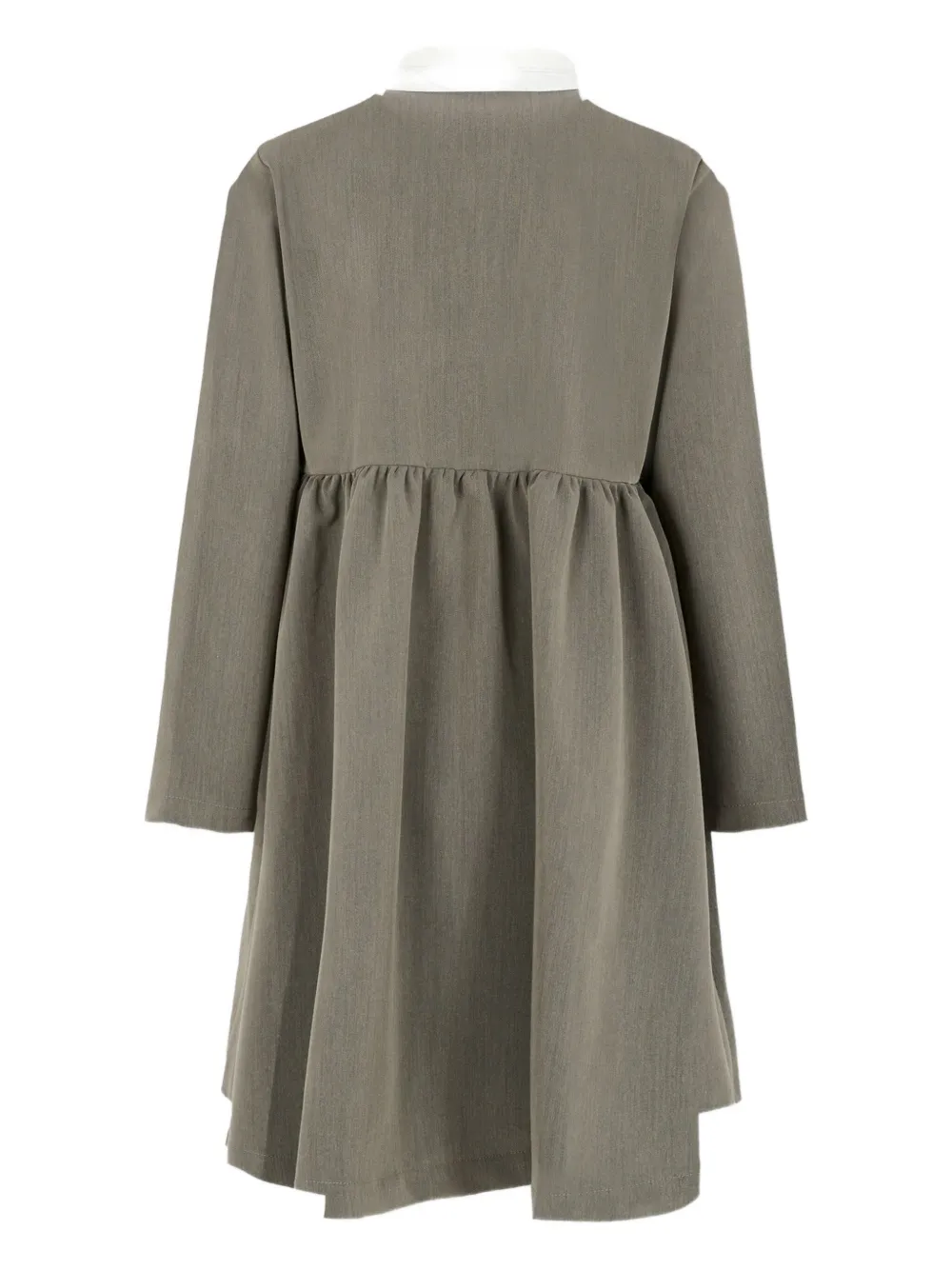 серое платье с застежкой на пуговицы, длинными рукавами, присборенной талией, белым воротником и украшением в виде сердца