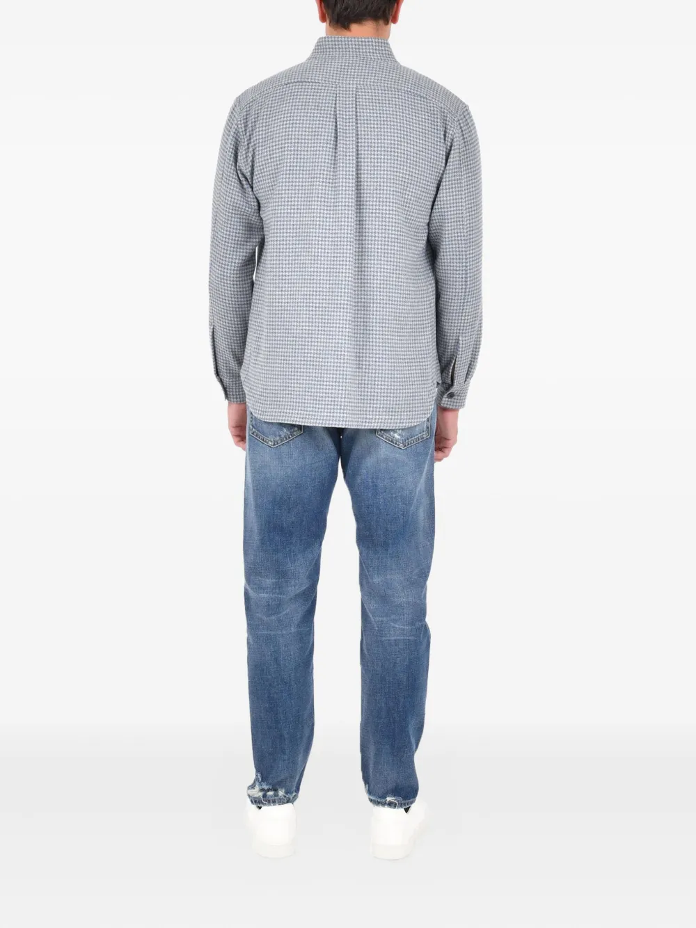 светло-голубой в клетку, застежка на пуговицы, длинные рукава, манжеты на пуговицах, нагрудные карманы