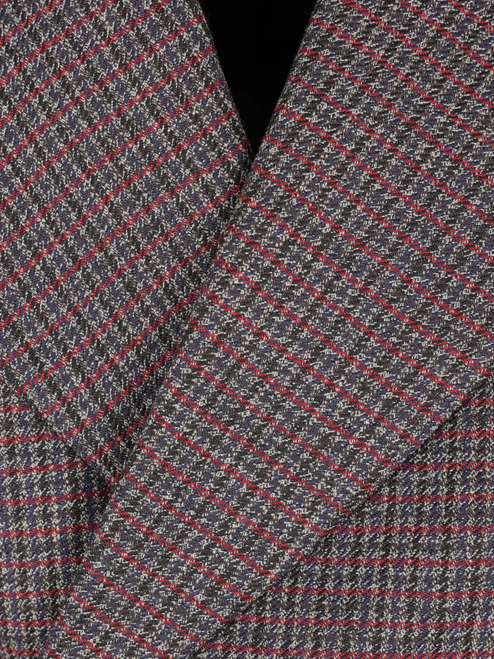 серо-красный клетчатый узор, застежка на пуговицы, двубортный, заостренные лацканы, нагрудный прорезной карман, клапанные карманы