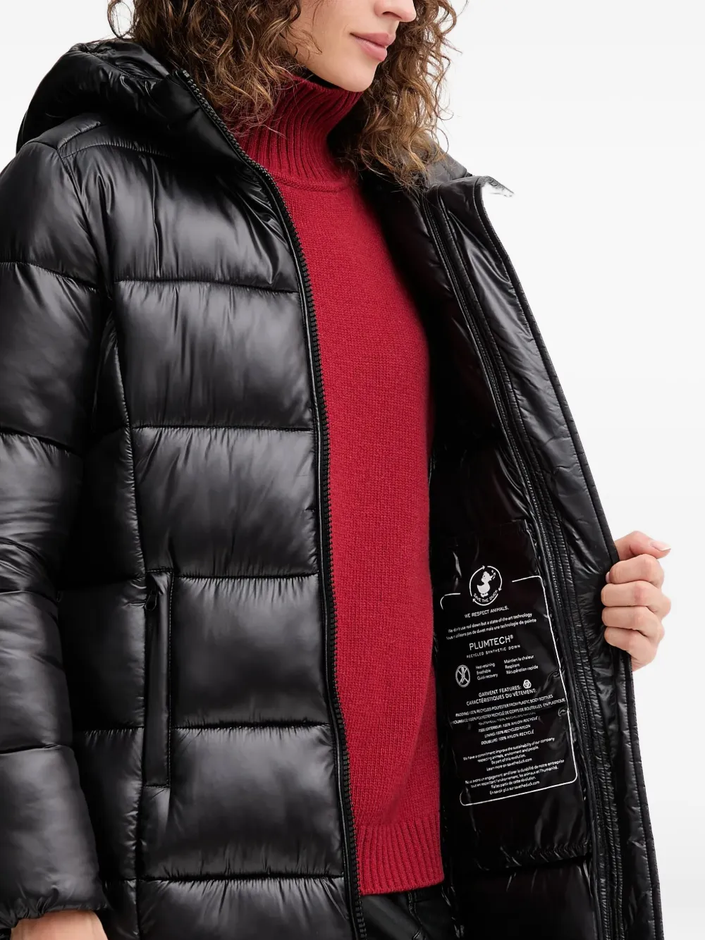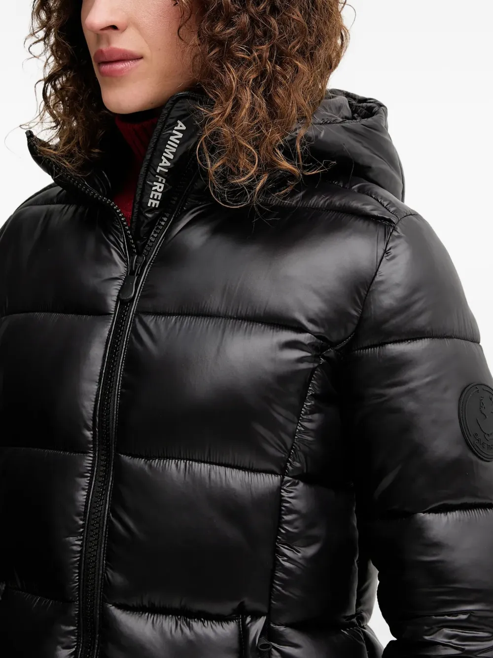 черная стеганая куртка с капюшоном, застежкой-молнией, нашивкой-логотипом и передними карманами