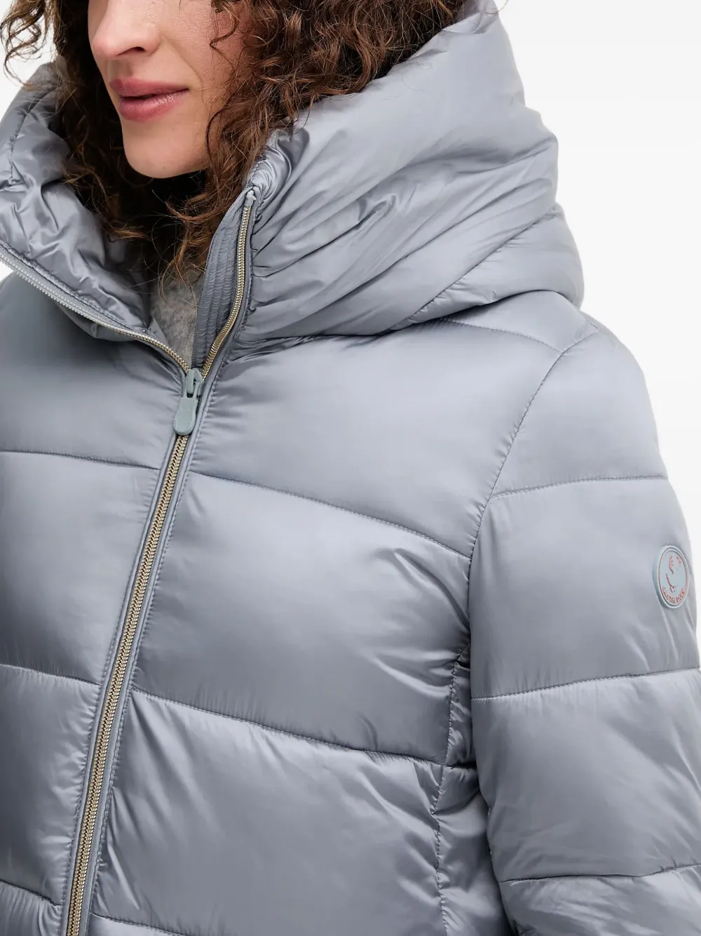 светло-серый цвет, стеганый дизайн, простеганная отделка, нашивка с логотипом, застежка на молнию, несъемный капюшон, длинные рукава, два боковых кармана