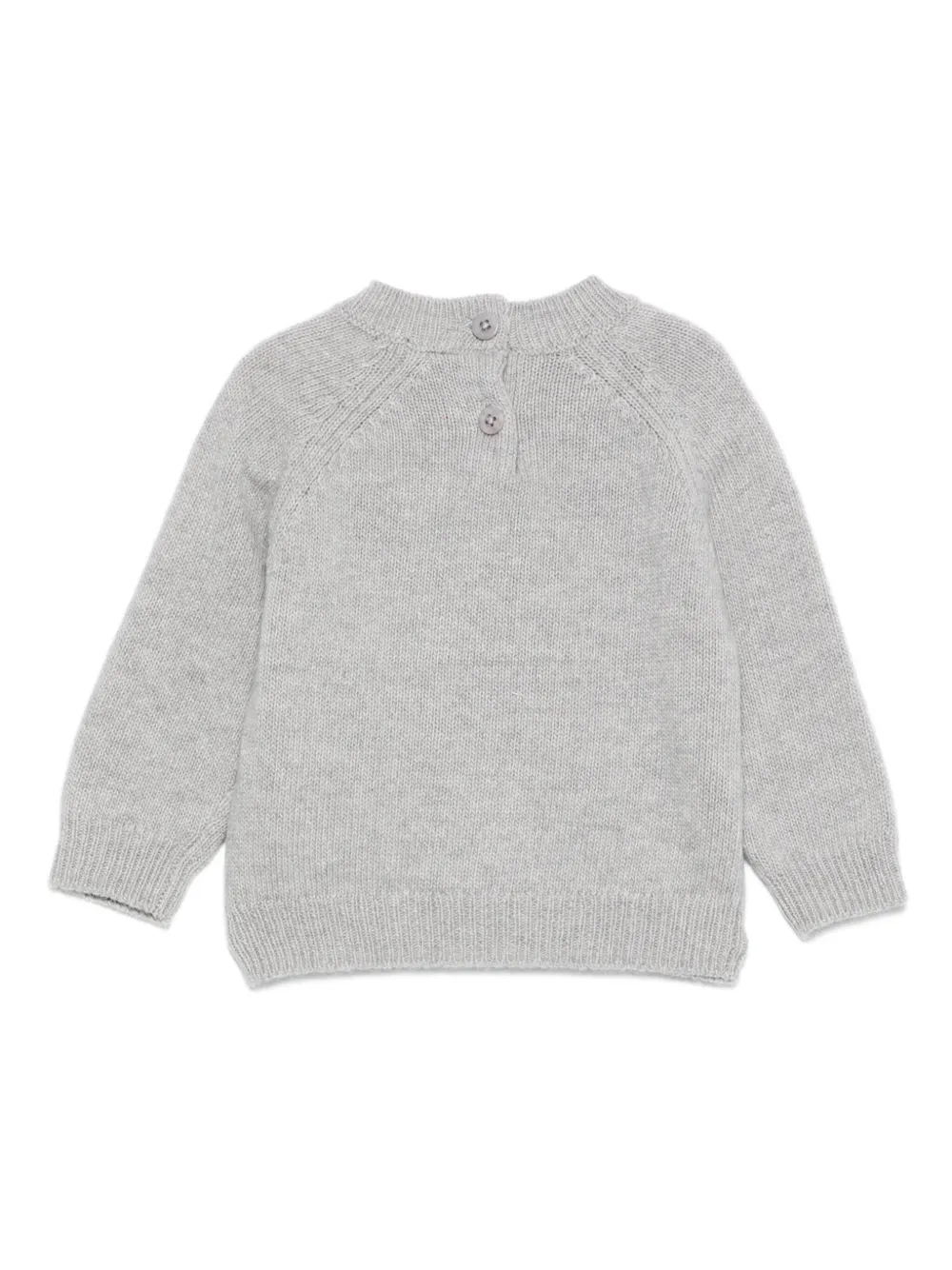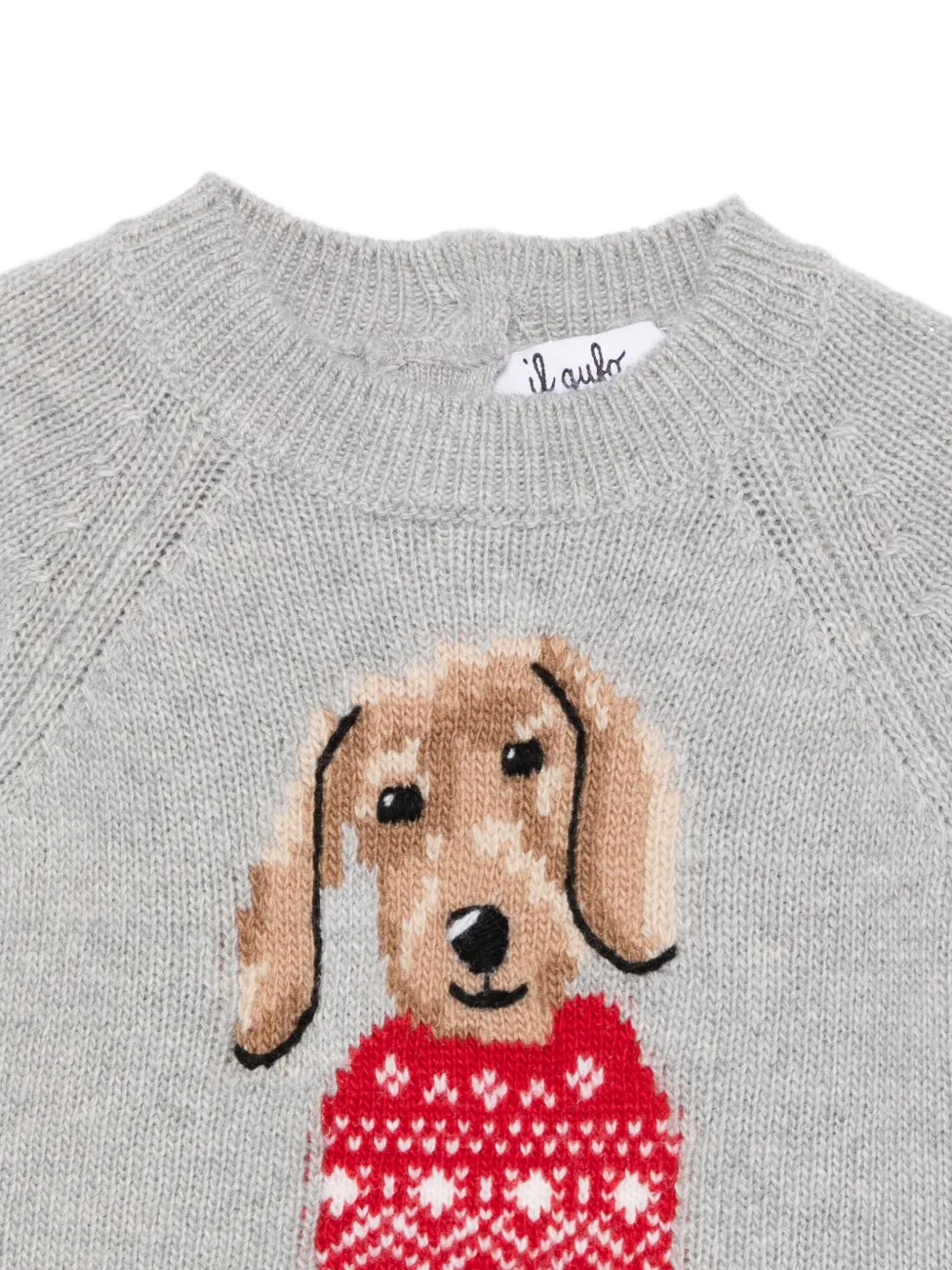 серый свитер с вышивкой собаки, круглый вырез, длинные рукава, застежка на пуговицы сзади