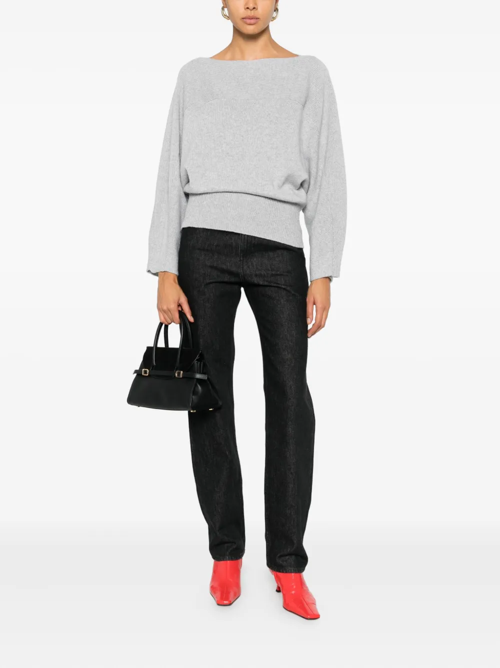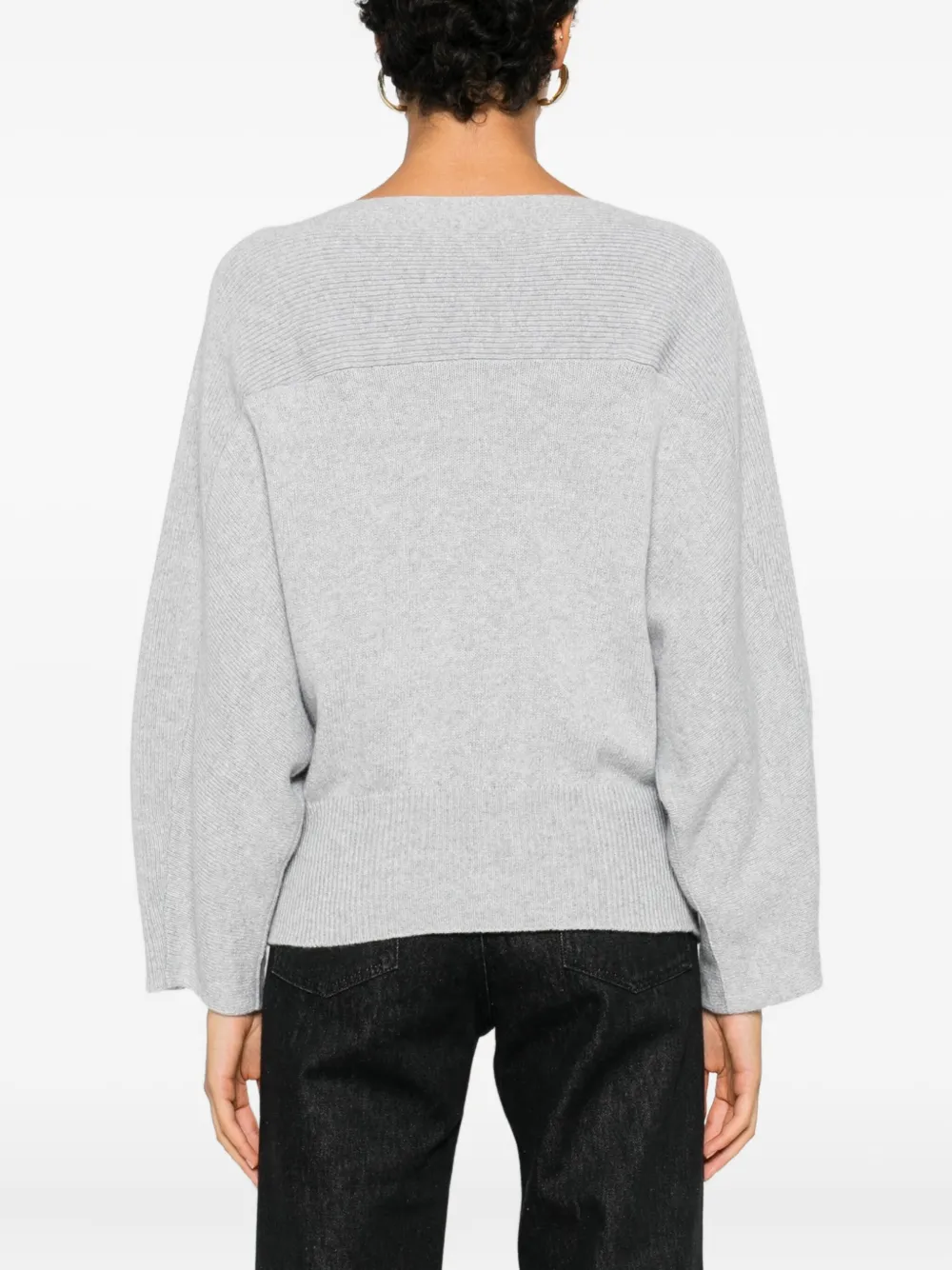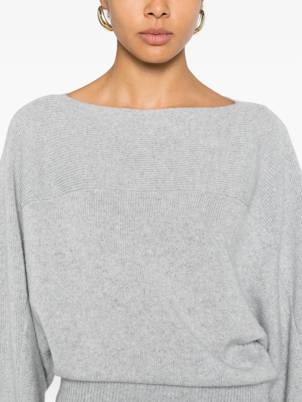 светло-серый цвет, ребристые детали, вырез "лодочка", длинные рукава, прямой край