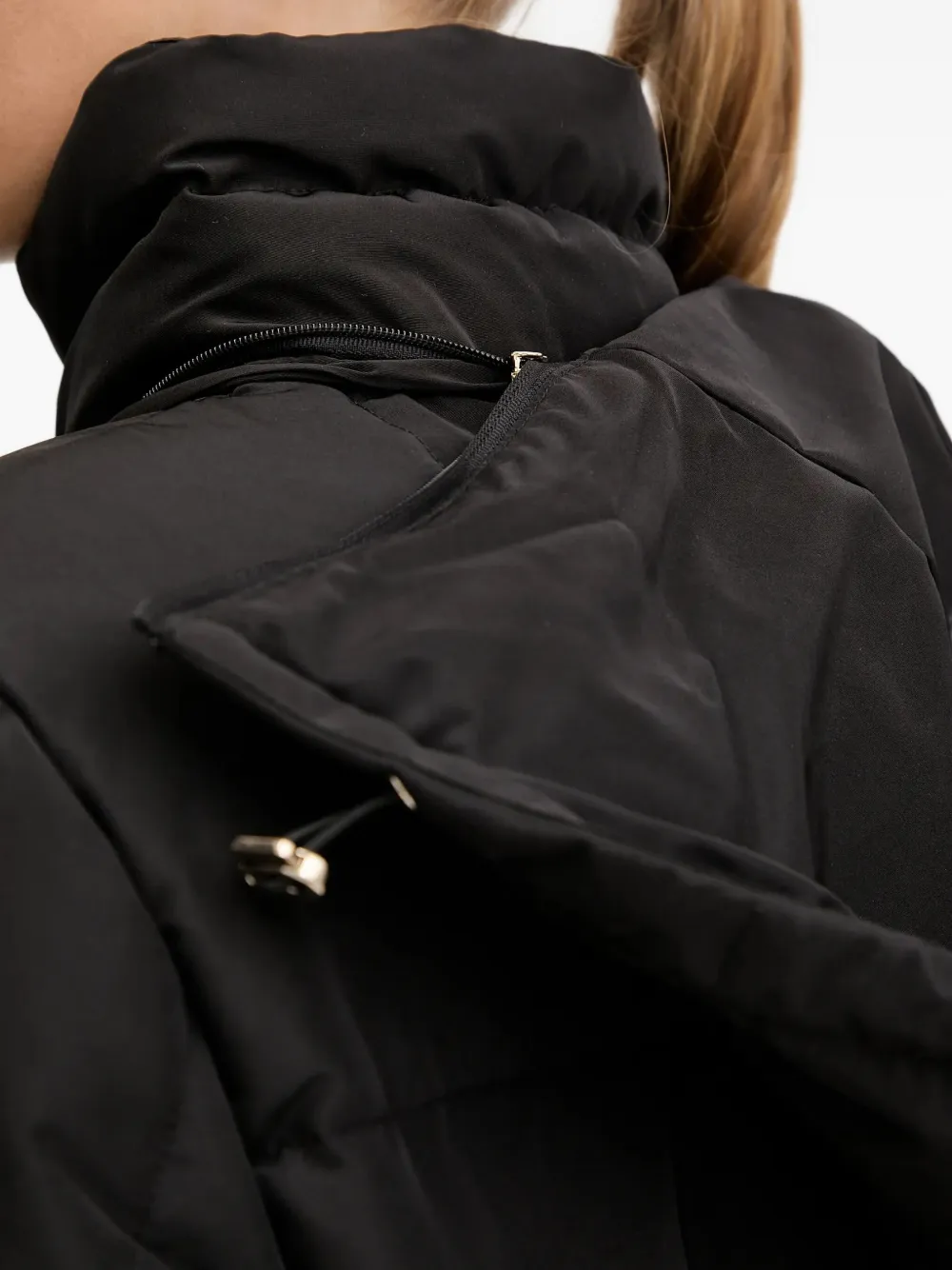черная стеганая отделка, дизайн с утеплителем, регулируемый капюшон, застежка на молнии, длинные рукава, боковые карманы