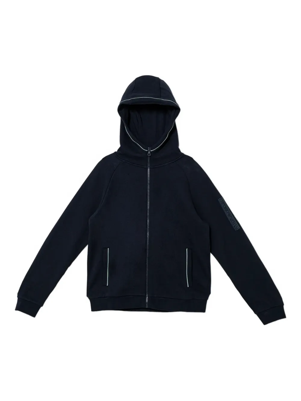 темно-синий худи с логотипом, застежкой-молнией, капюшоном и длинными рукавами