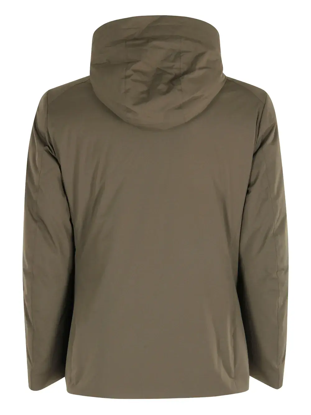 темно-зеленый с капюшоном, накладные карманы спереди, прорезные карманы спереди, длинные рукава, прямой подол
