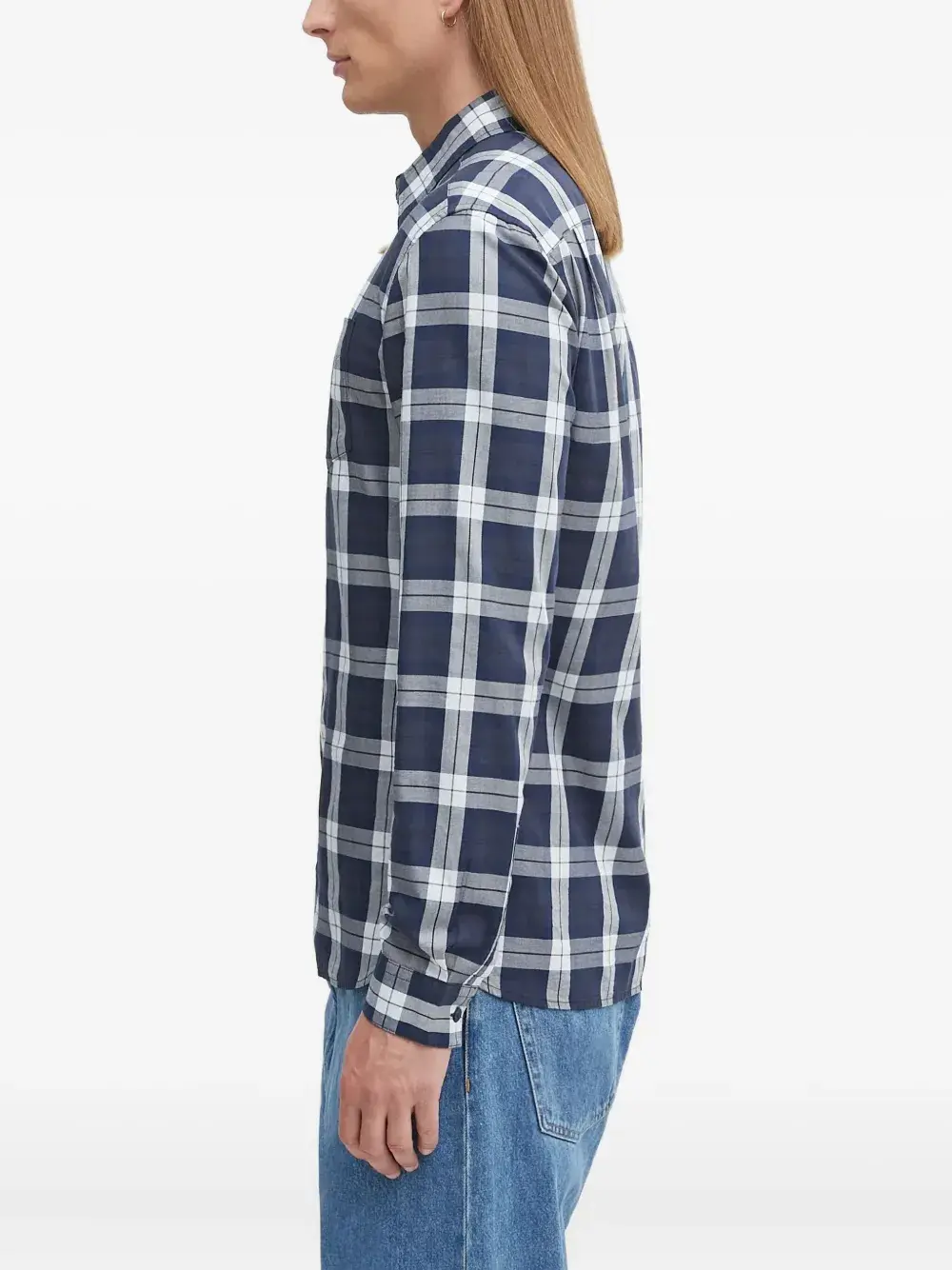 синяя рубашка в клетку с вышитым логотипом, застежкой на пуговицы, длинными рукавами и накладным карманом