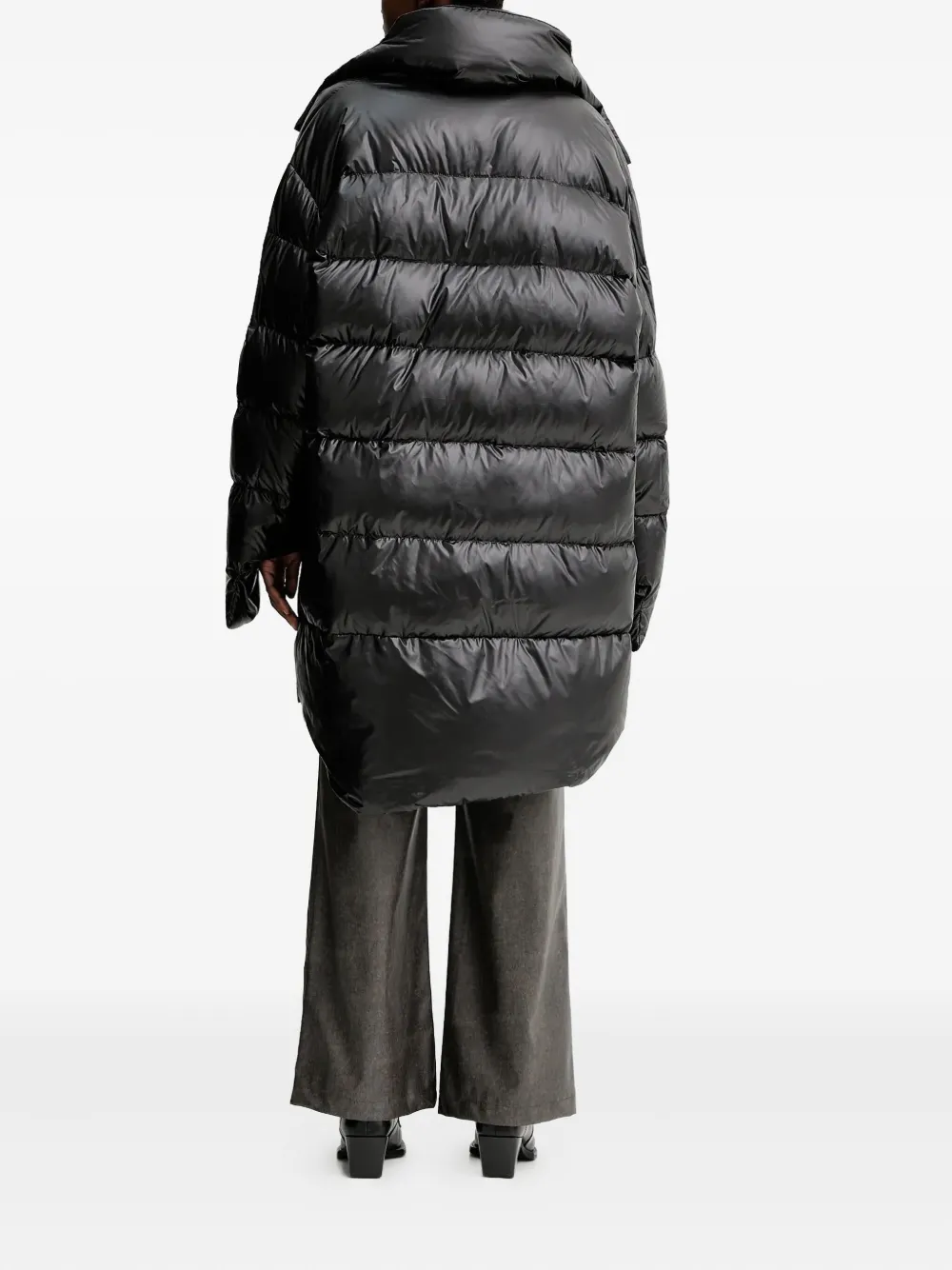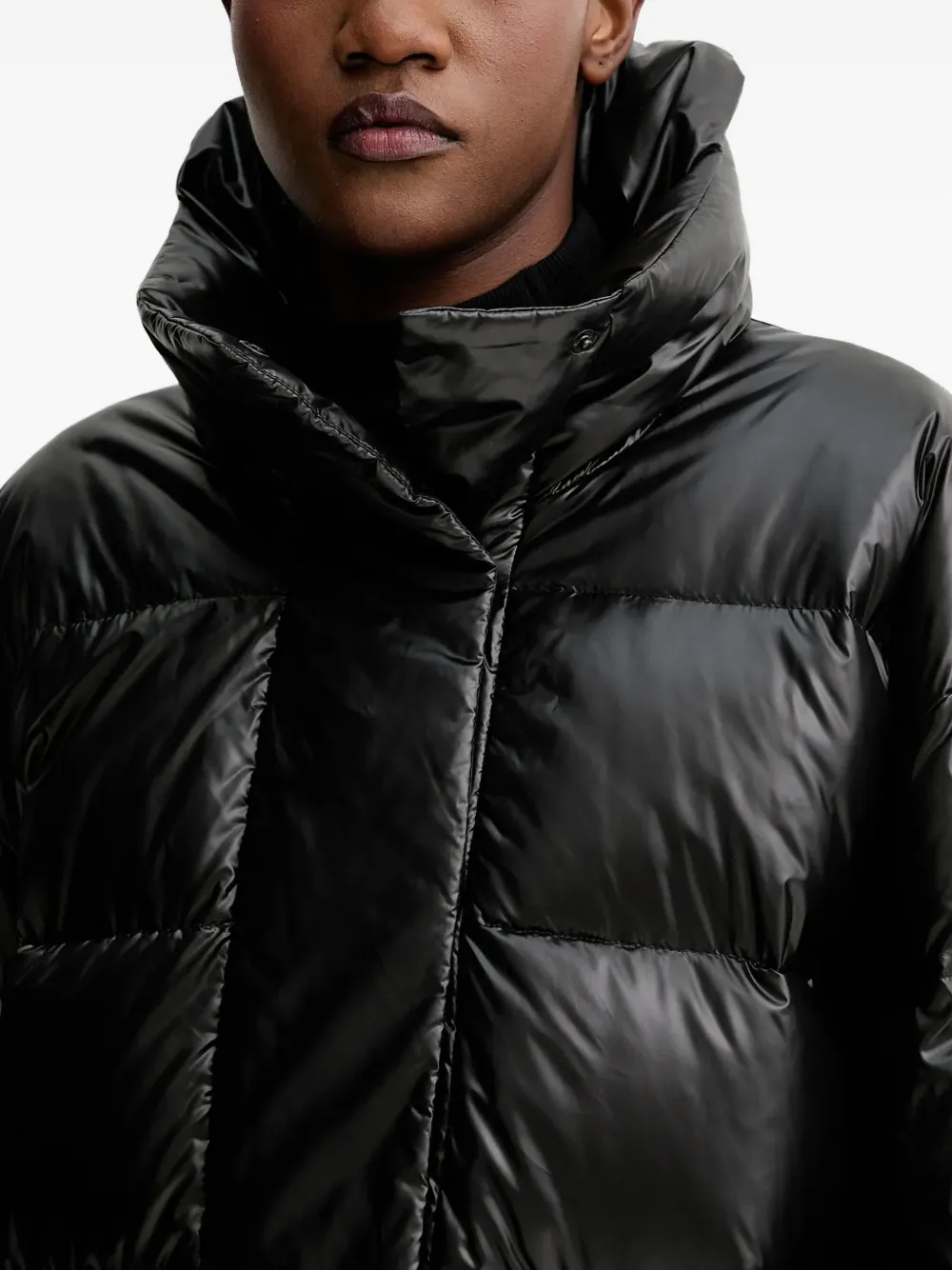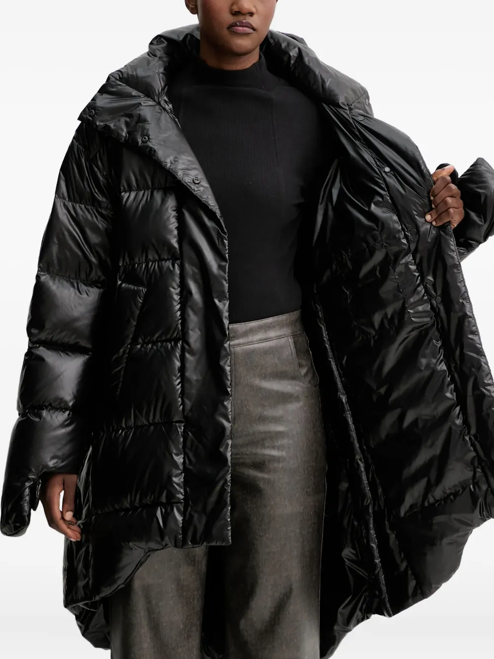 чёрный пуховик с высоким воротником, стёганой отделкой, несъёмным капюшоном, нашивкой с логотипом, скрытой застёжкой на кнопки, длинными рукавами, двумя боковыми карманами и асимметричным подолом