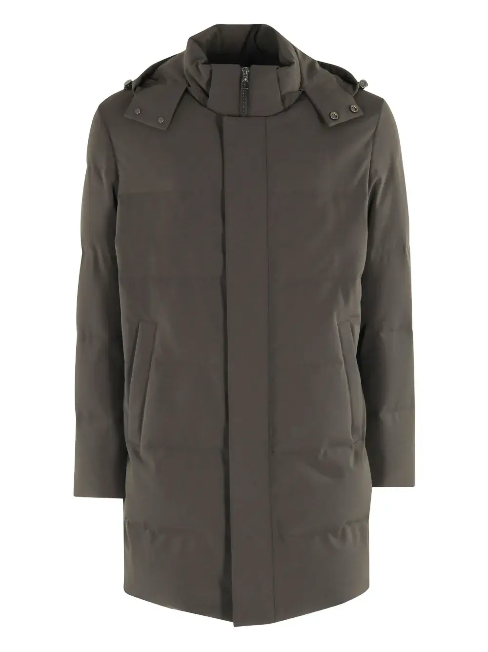 темно-серый капюшон, застежка на пуговицах, передние карманы, застежка-молния, прямой подол