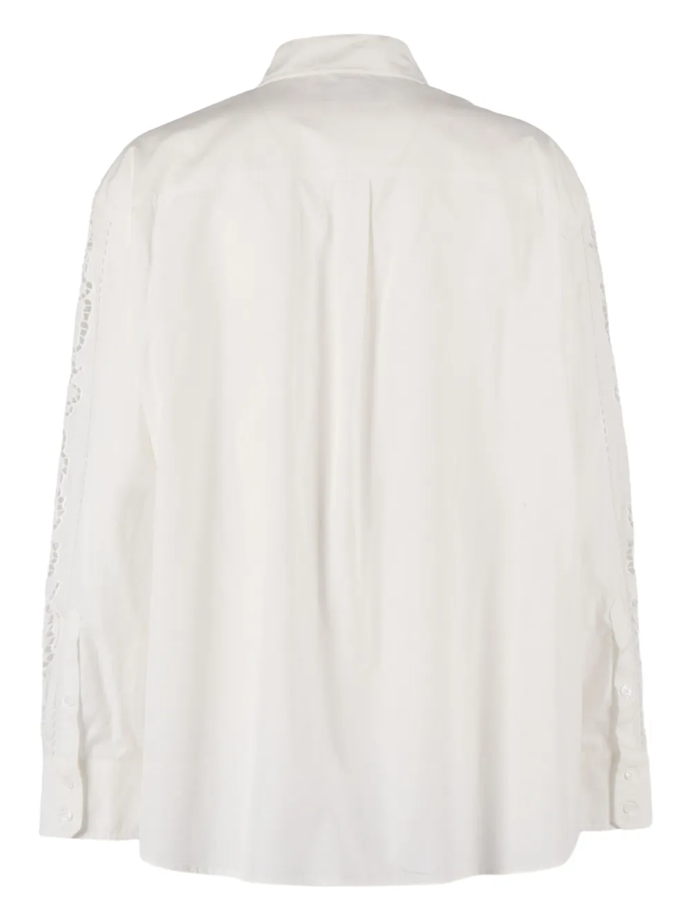 белая рубашка с цветочными кружевными вставками, застежкой на пуговицах, длинными рукавами, классическим воротником и манжетами на пуговицах