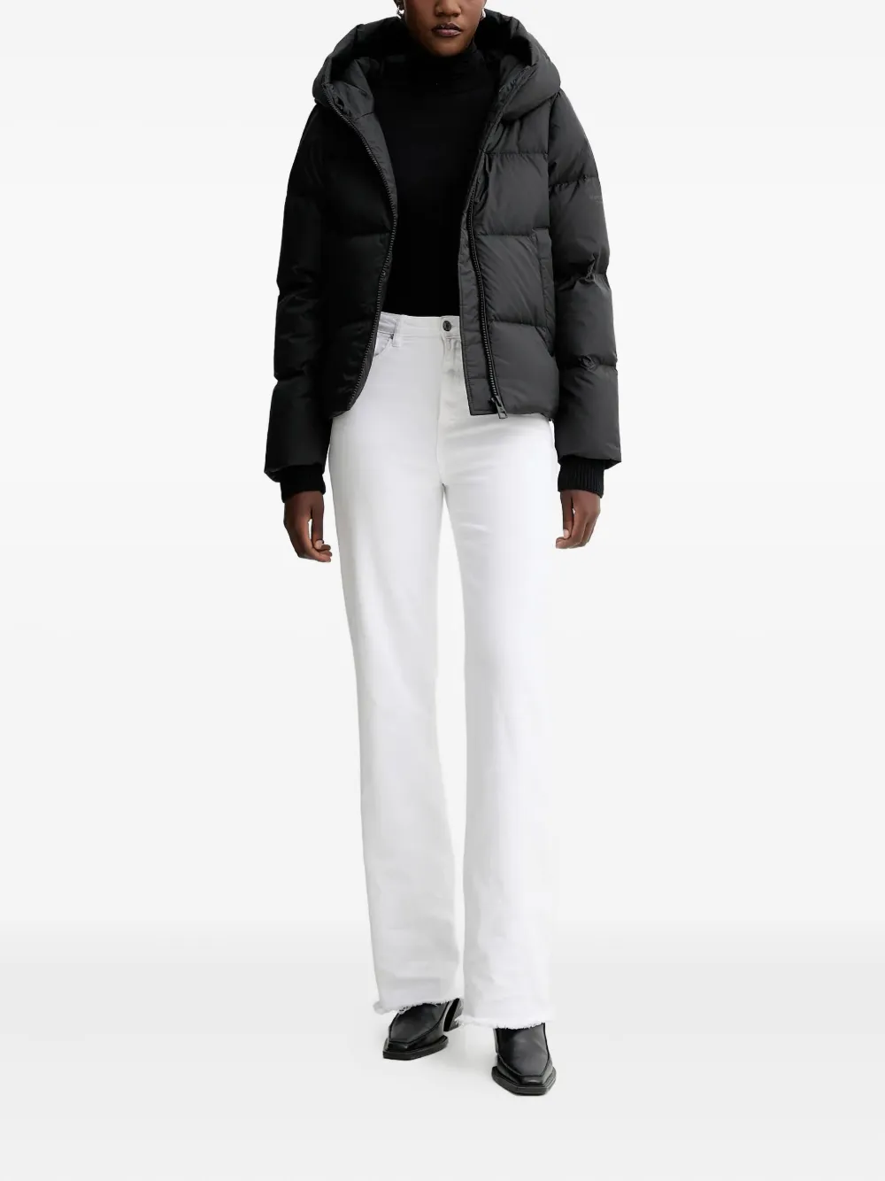 черная куртка с утеплённой стёжкой, фиксированным капюшоном, застёжкой-молнией, боковыми карманами, длинными рукавами и прямым подолом