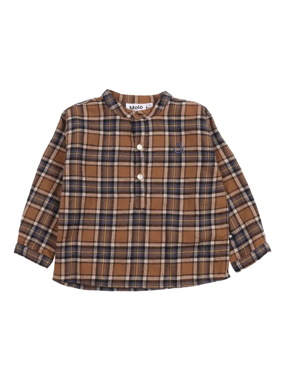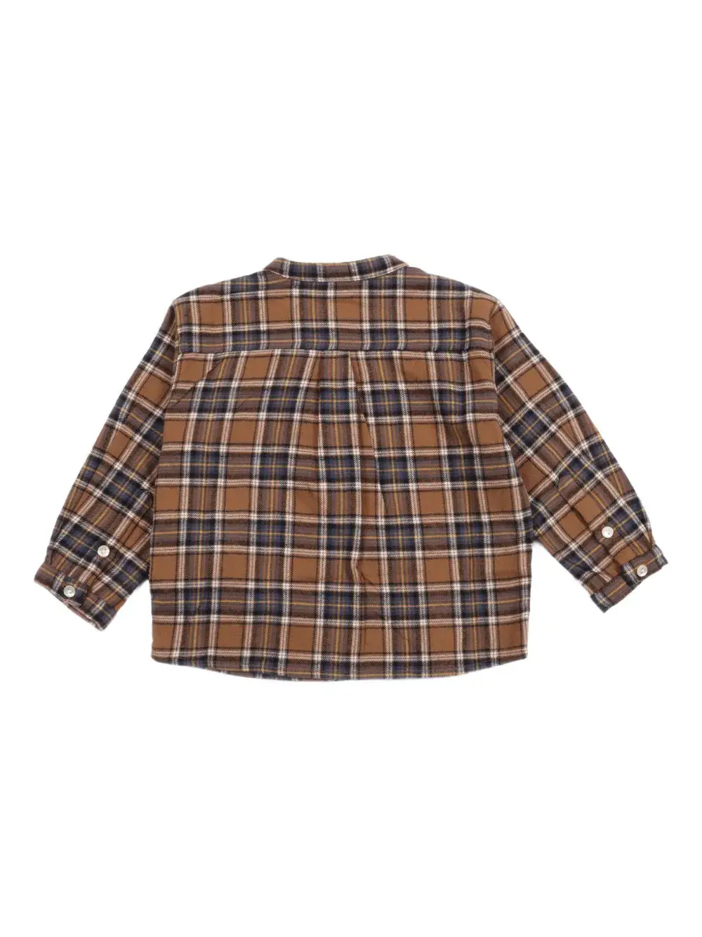 коричневая рубашка в клетку, застёжка на пуговицы, длинные рукава, вышитые детали, воротник-стойка