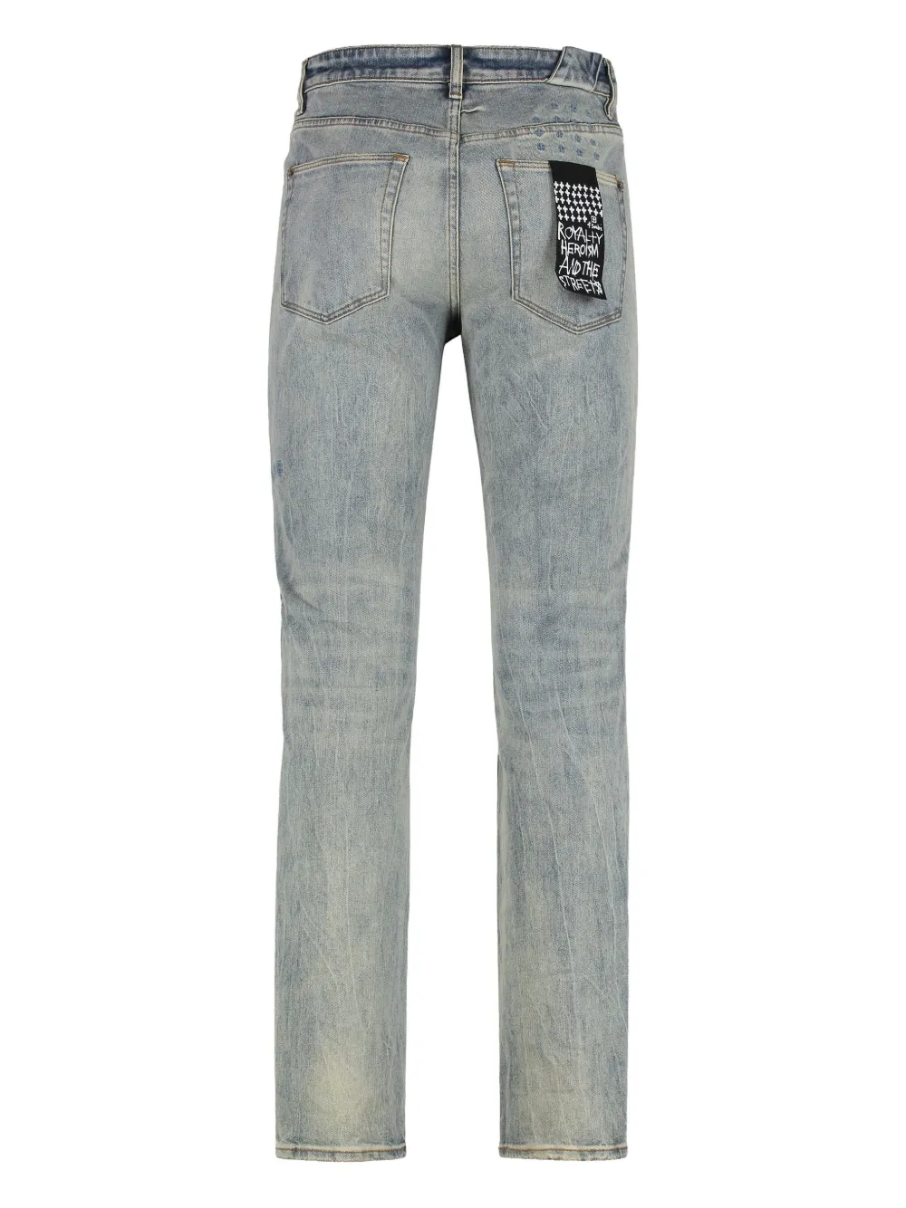 светло-голубые, застегиваются на пуговицы, пять карманов, шлёвки для ремня, эффект потертости