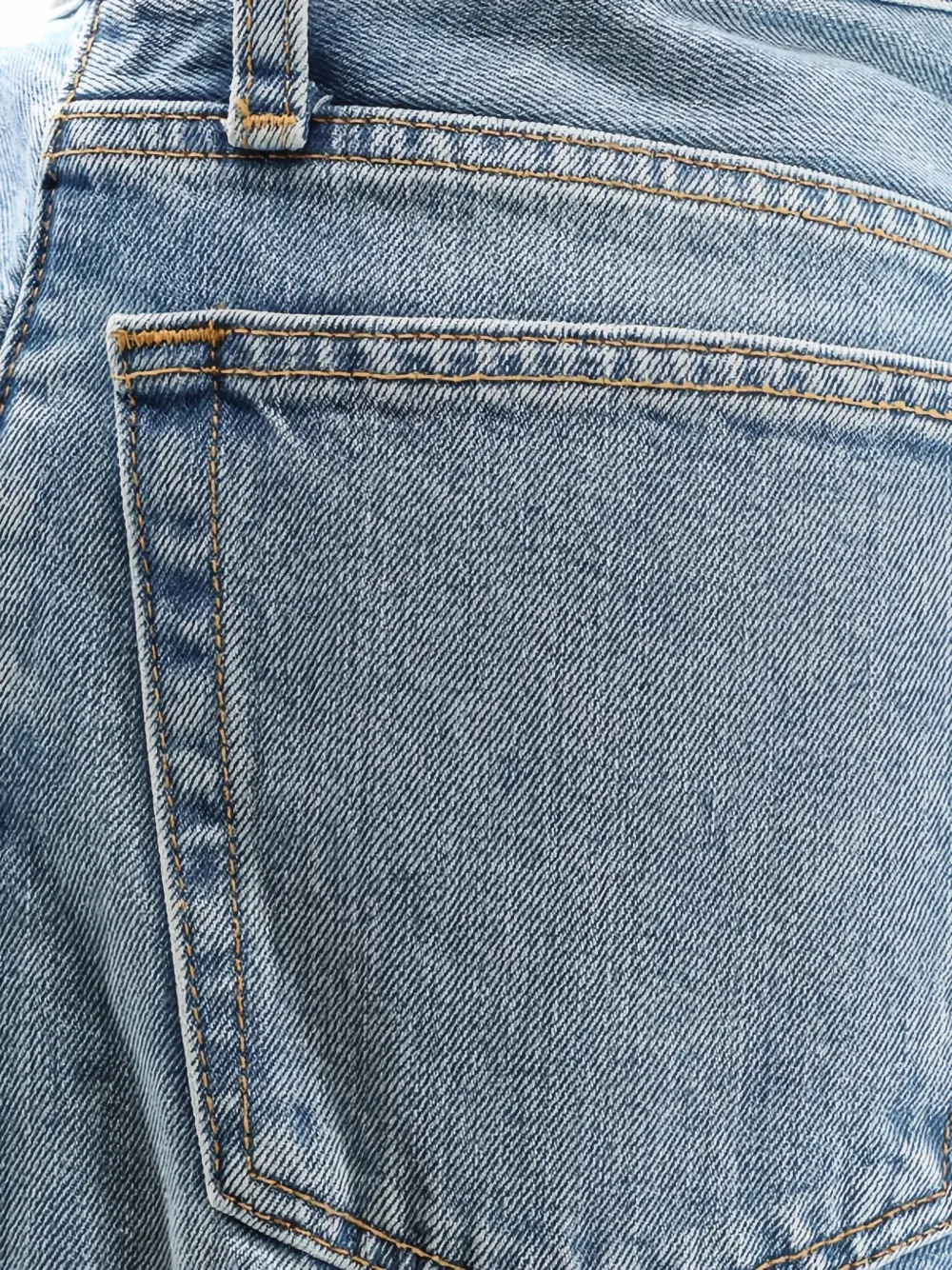 светло-голубые, пять карманов, шлевки для ремня, застёжка на пуговицу, подогнутый край