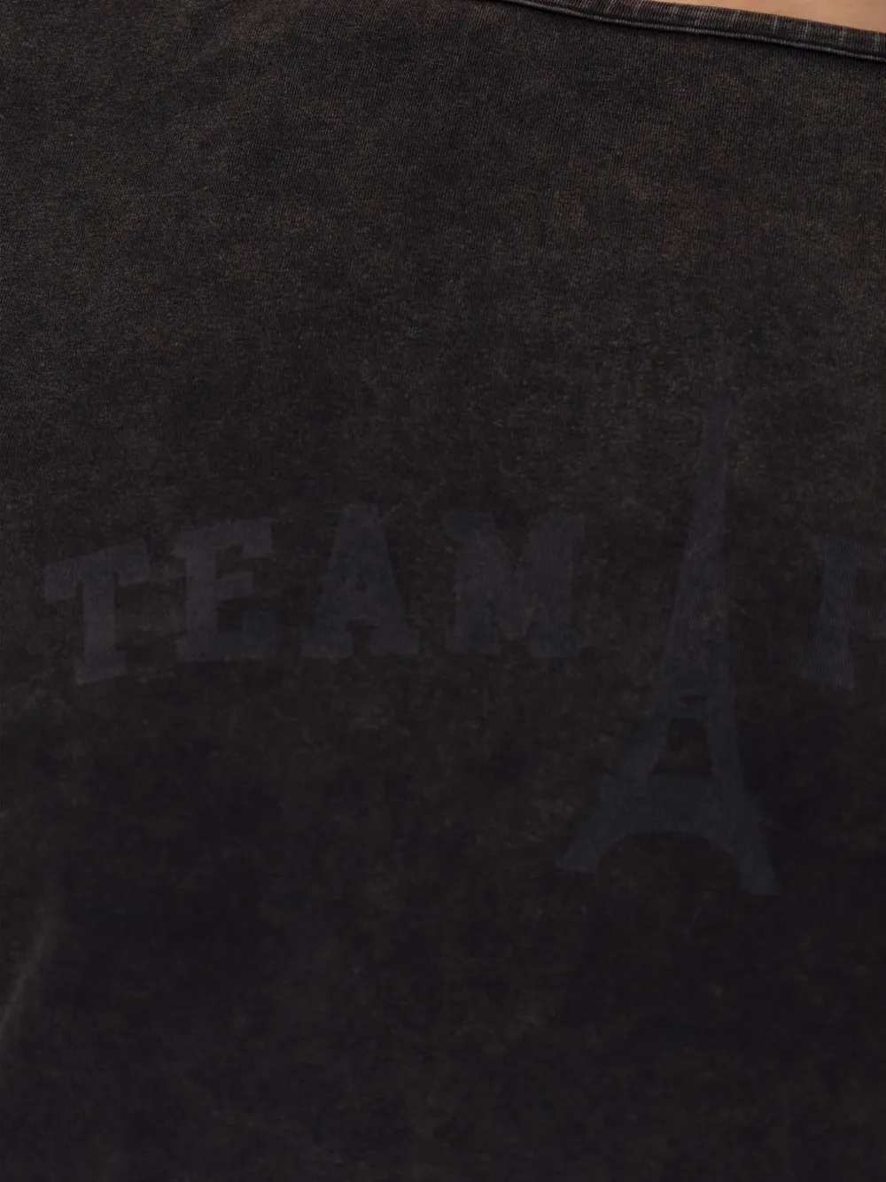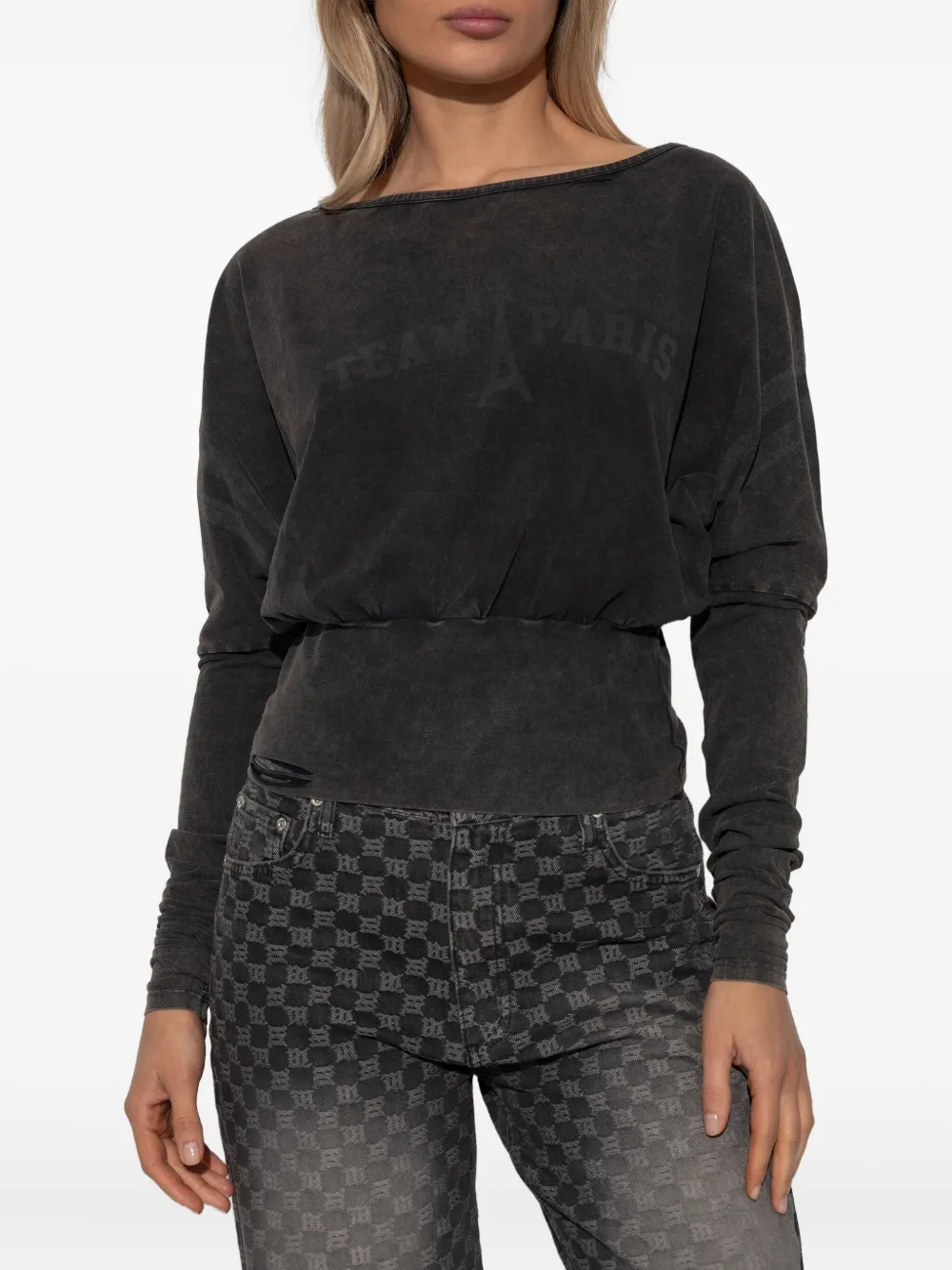 серый лонгслив с принтом, присборенной талией и вырезом "лодочка"