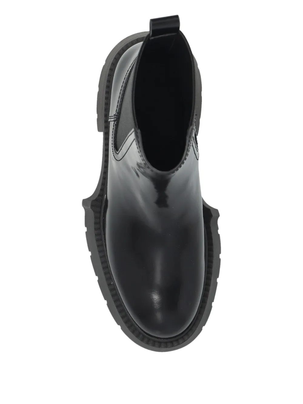 черная телячья кожа, рифленая подошва, петля для натягивания на голенище, эластичные боковые вставки, массивный каблук
