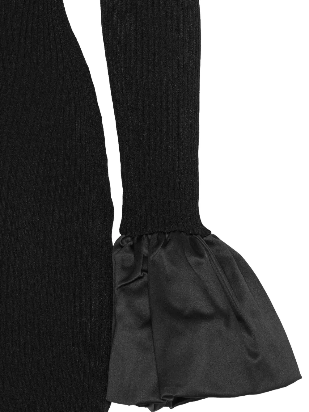 черная трикотажная фактура, вырез сзади, длинные рукава, расклешенные манжеты, мини-длина