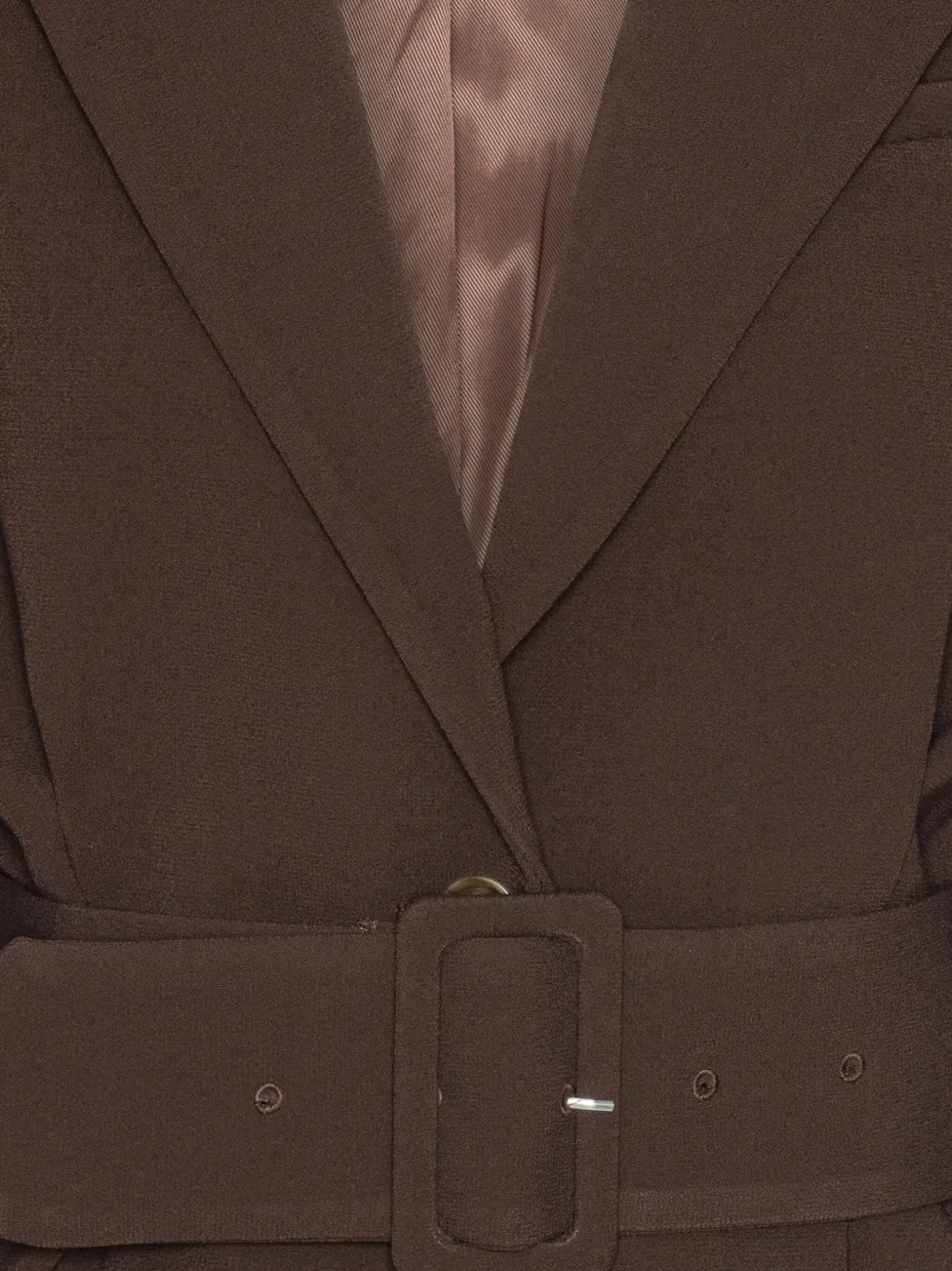 коричневый цвет, лацканы с вырезом, застёжка на пуговицы, пояс, структурированные плечи, длинные рукава