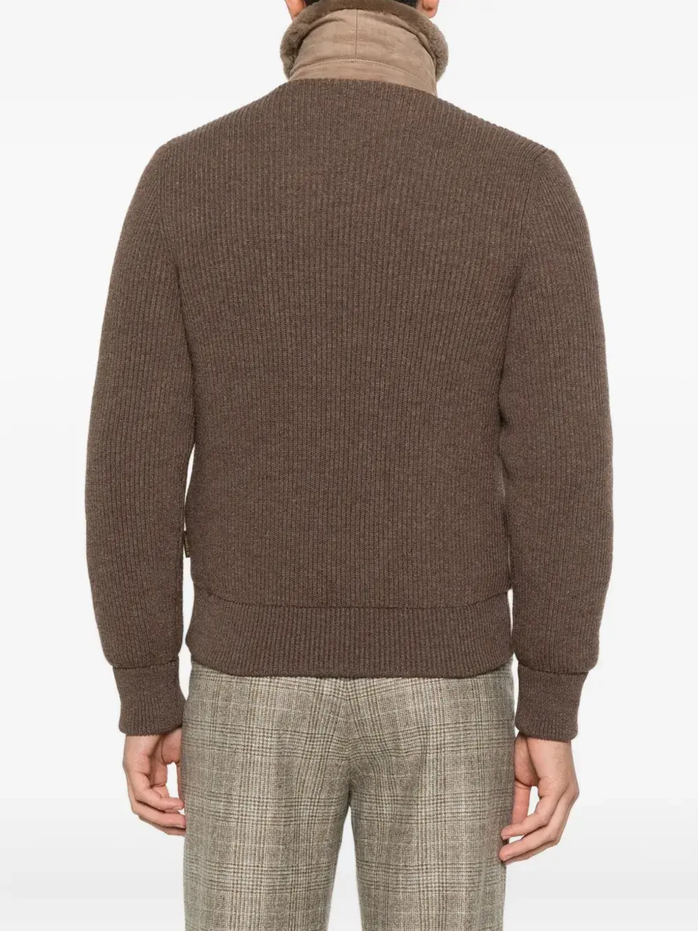 светло-коричневый цвет, застежка-молния, карманы на молнии, вязаные рукава, ребристый низ