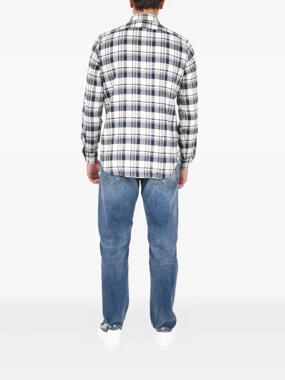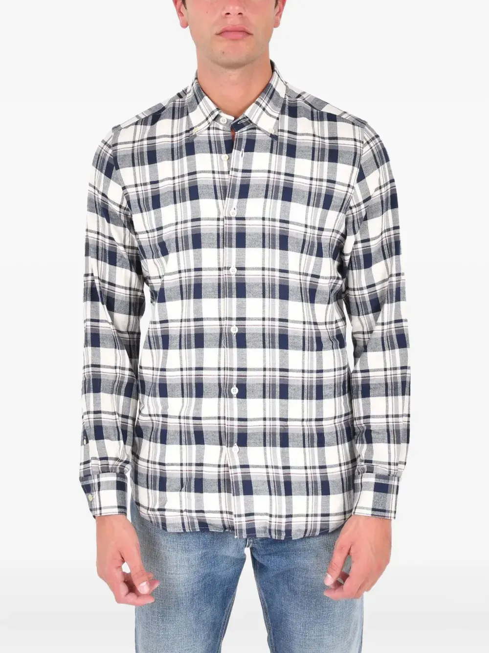 белая рубашка в клетку с застежкой на пуговицы, длинными рукавами и манжетами на пуговицах