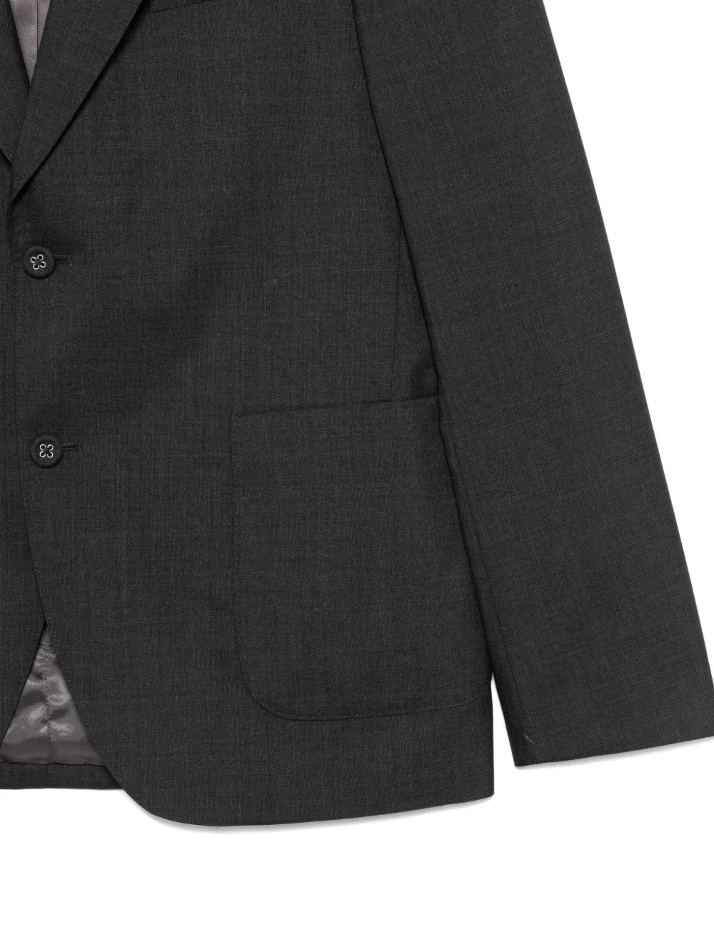 серого цвета, двухпуговичная застежка, лацканы с вырезом, накладные карманы спереди, длинные рукава, манжеты на пуговицах