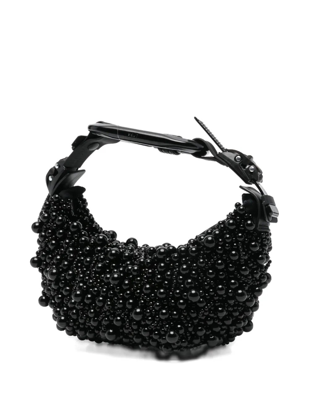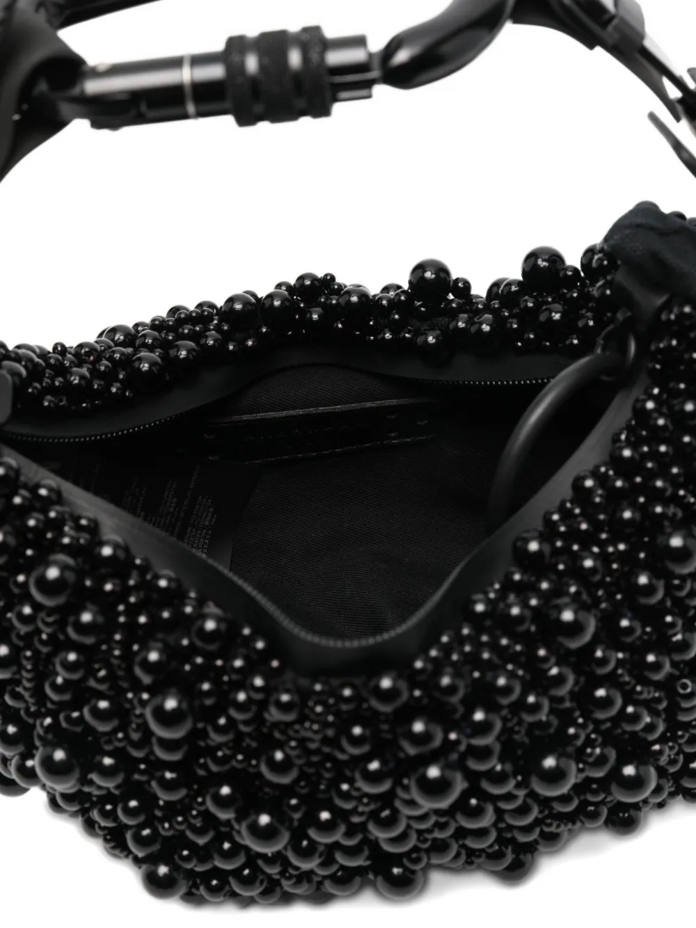 черная сумка с отделкой из искусственного жемчуга, верхняя ручка, карабин, застежка-молния, внутренний накладной карман