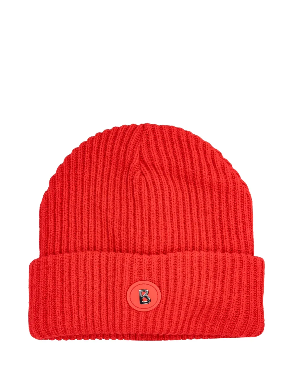 красная вязаная шапка с отворотом и нашивкой с логотипом