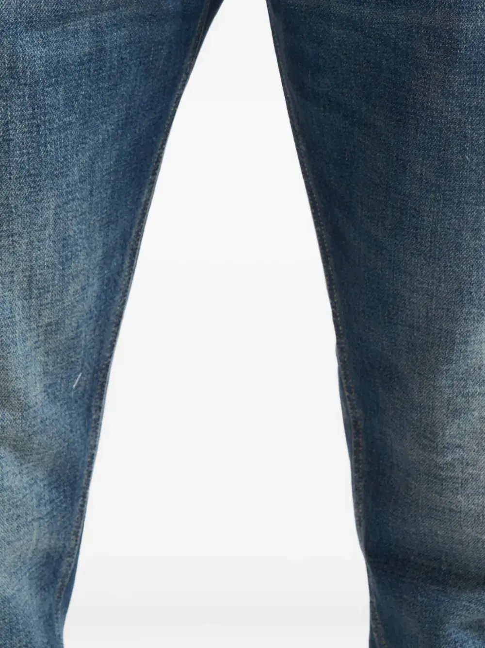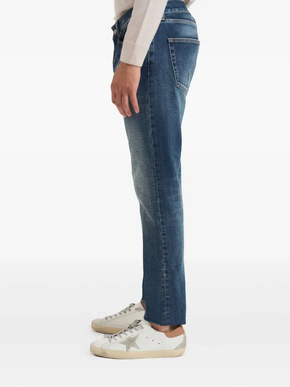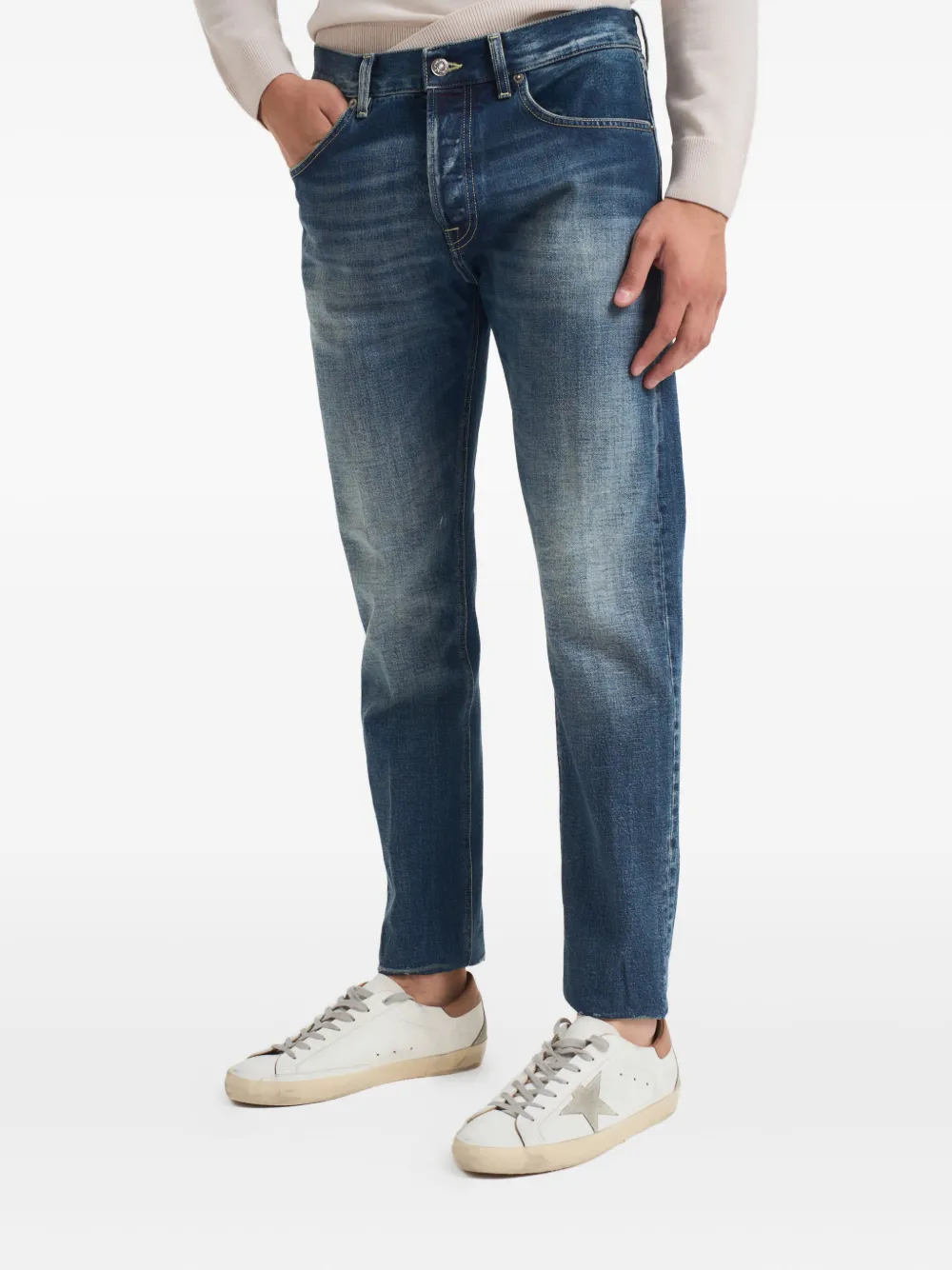 синие классические джинсы с застежкой на пуговицы, пятью карманами и контрастной прострочкой