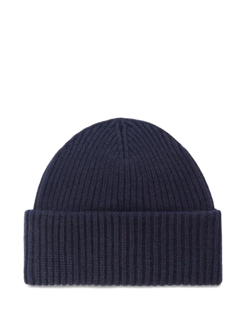тёмно-синяя вязаная шапка в рубчик с подвернутым краем и декоративной строчкой