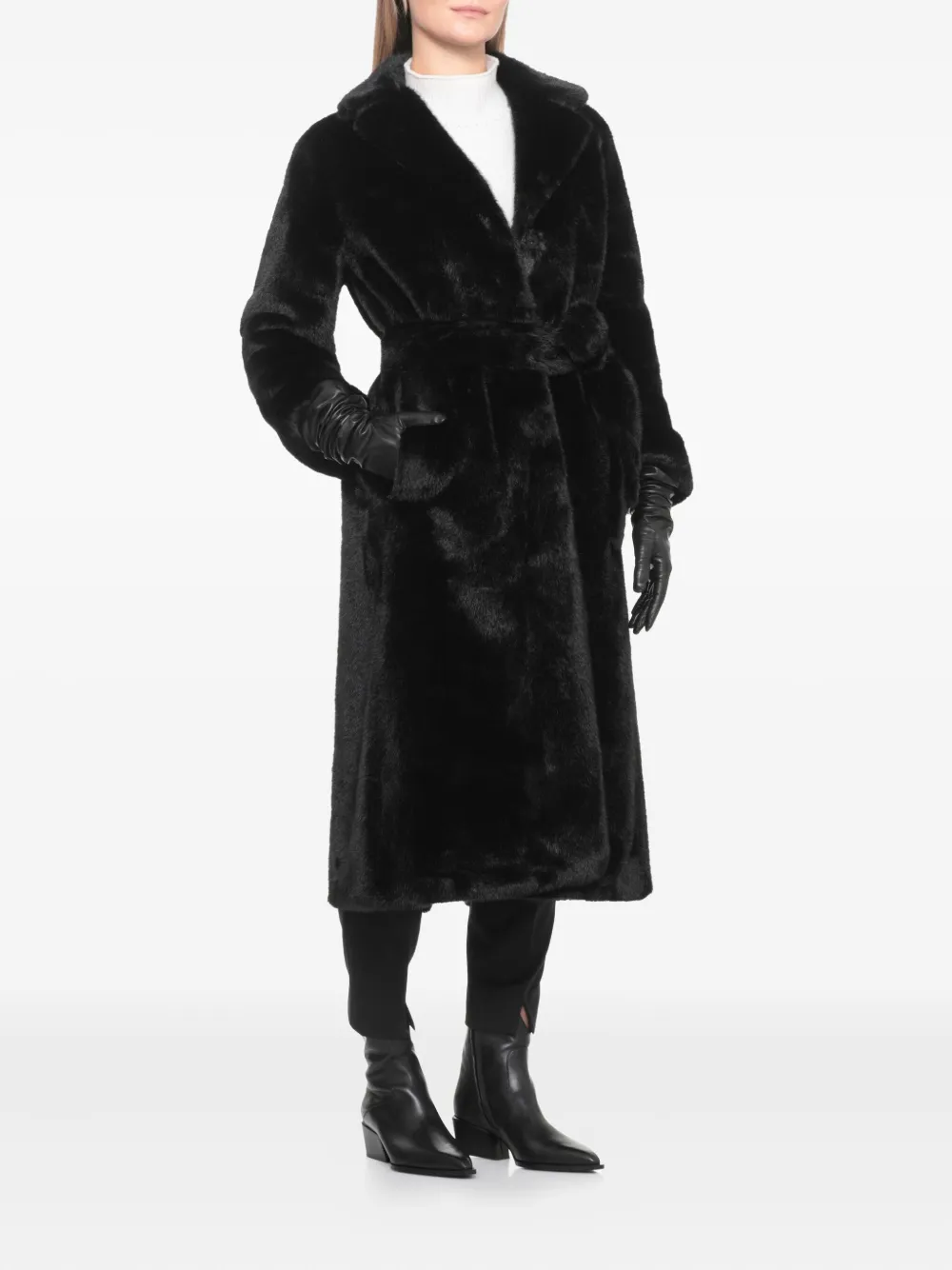 черные лацканы с вырезом, пояс на поясе, длинные рукава, прорезные карманы