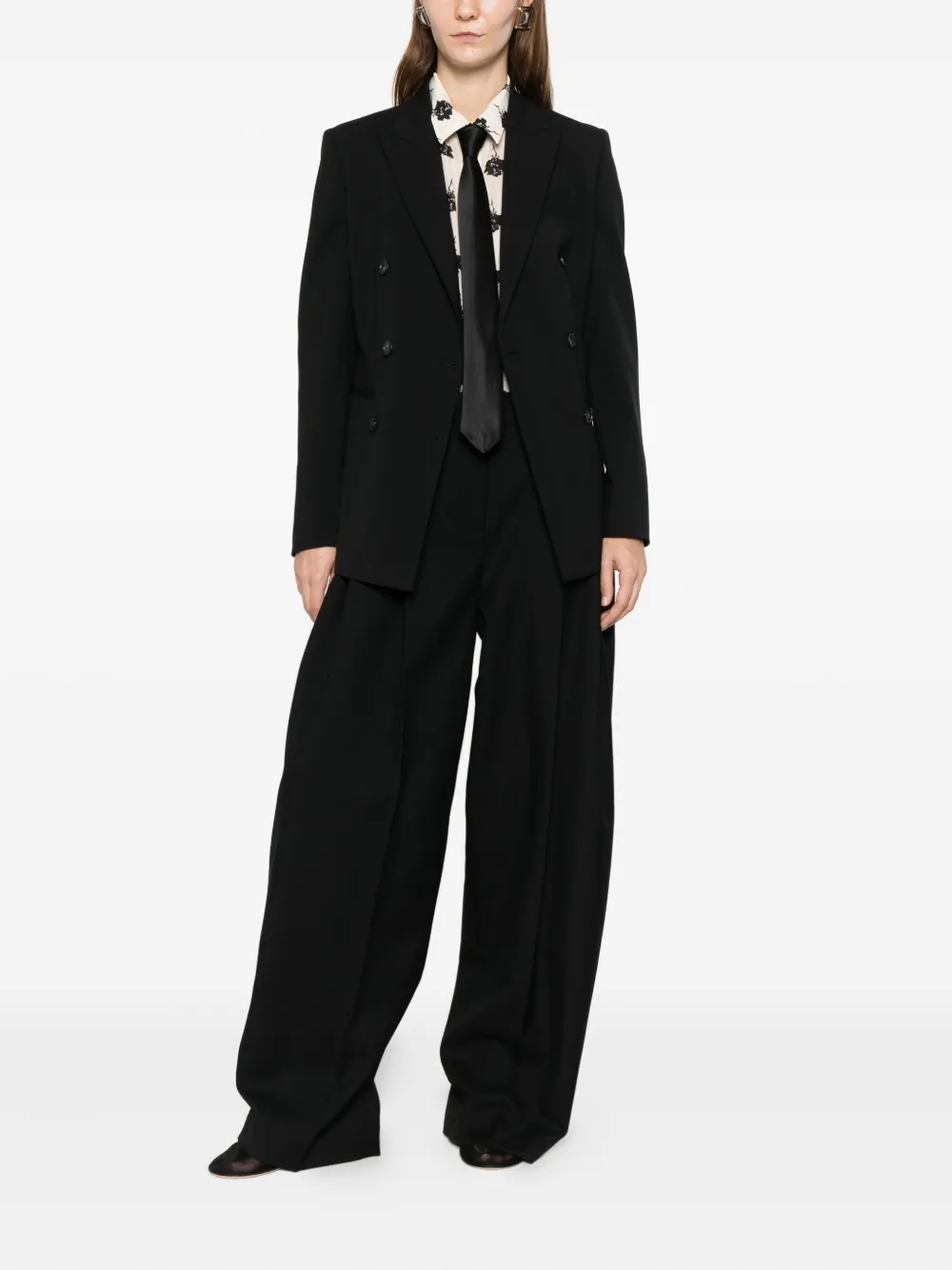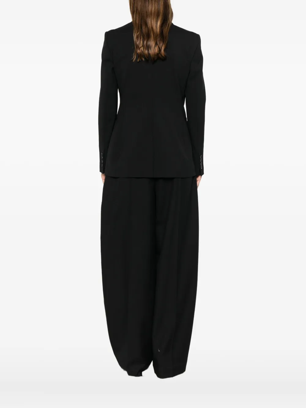 черная шерсть, двубортная застежка на пуговицы, острые лацканы, манжеты на пуговицах