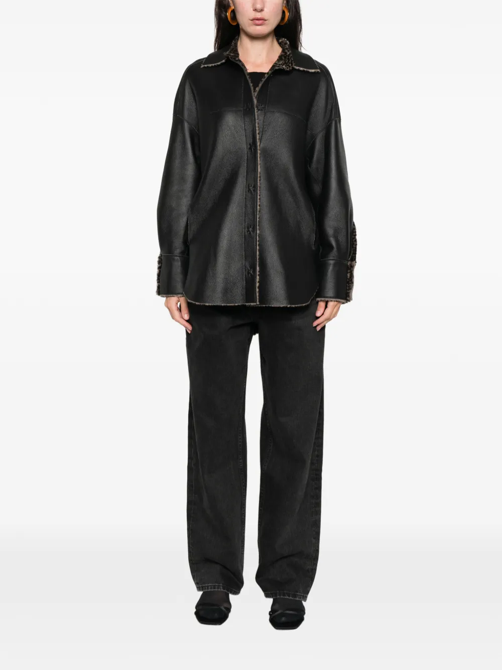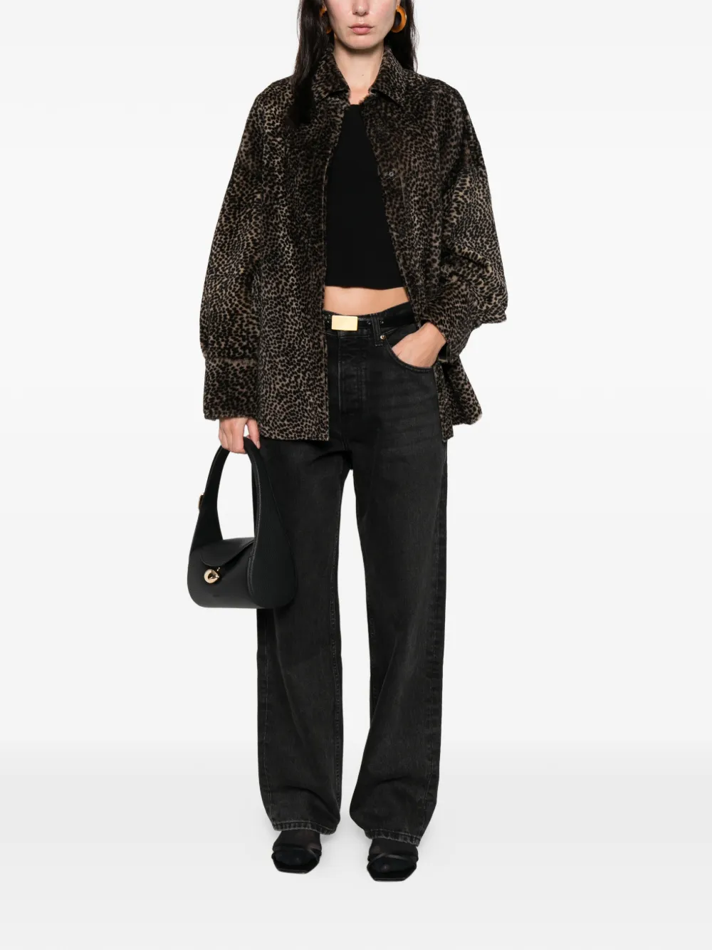 чёрная рубашка с анималистичным принтом, застёжка на пуговицы, длинные рукава, закруглённый подол